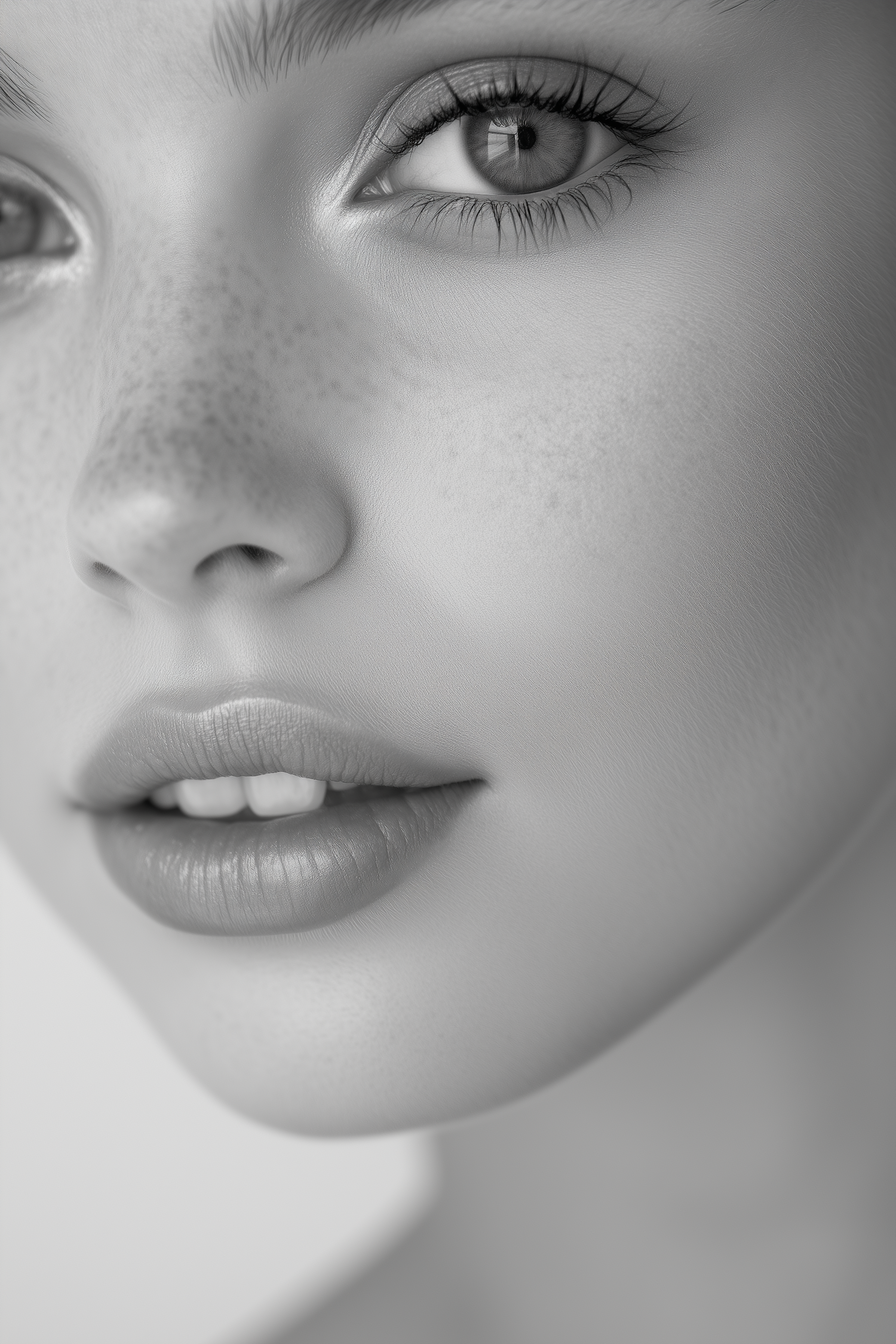 Monochromatic close-up of a young woman's freckled face, focusing on her detailed eye, smooth skin, and slightly parted lips.