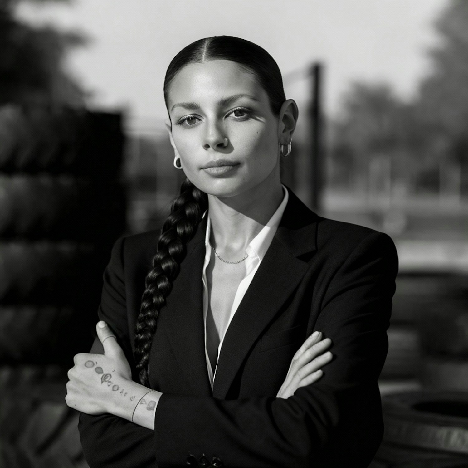 Monochrome portrait of a confident woman in formal attire with a sleek braid, standing outdoors with a blurred background.