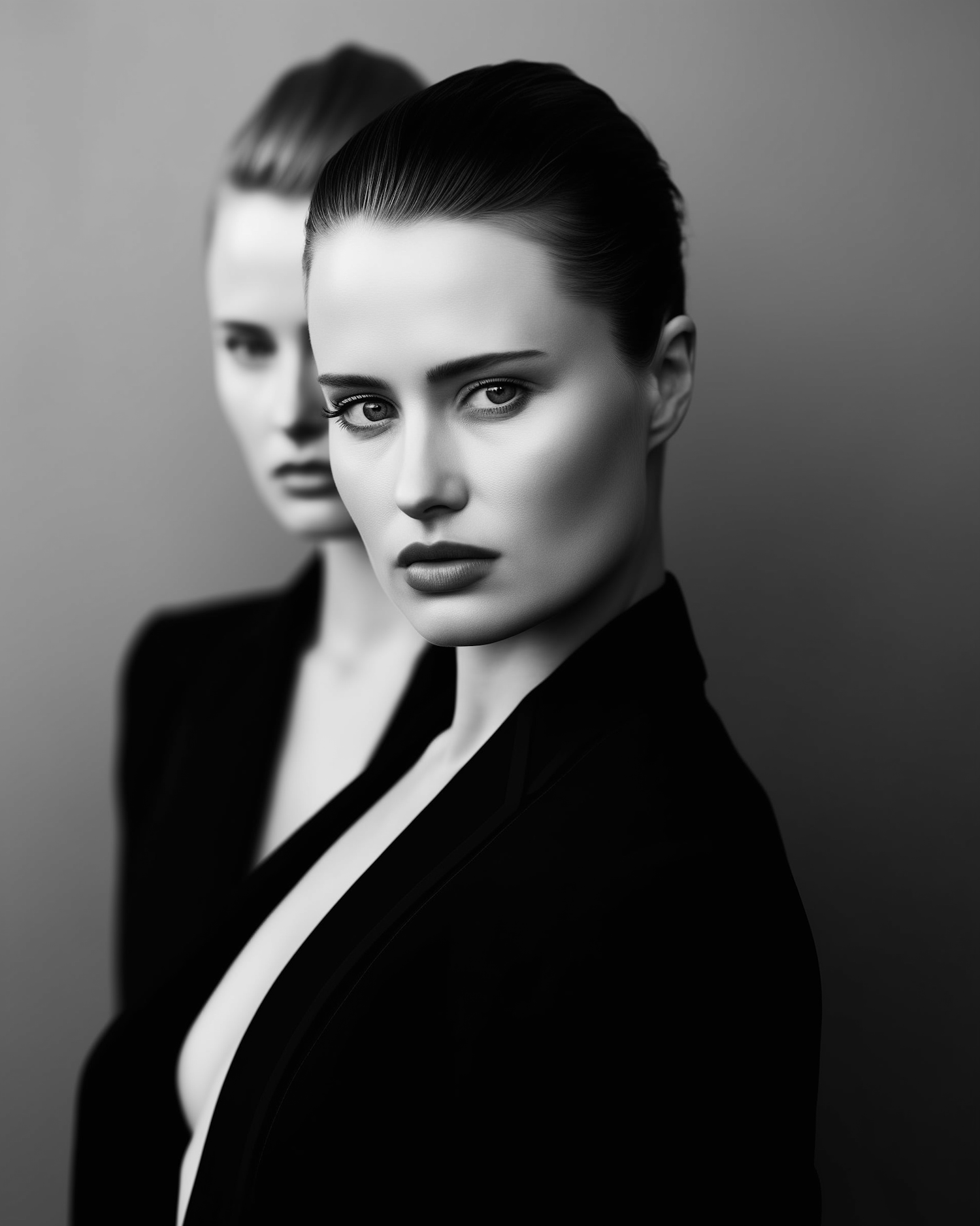 Striking black-and-white portrait of two women in sleek blazers, with sharp contrasts and intense expressions.