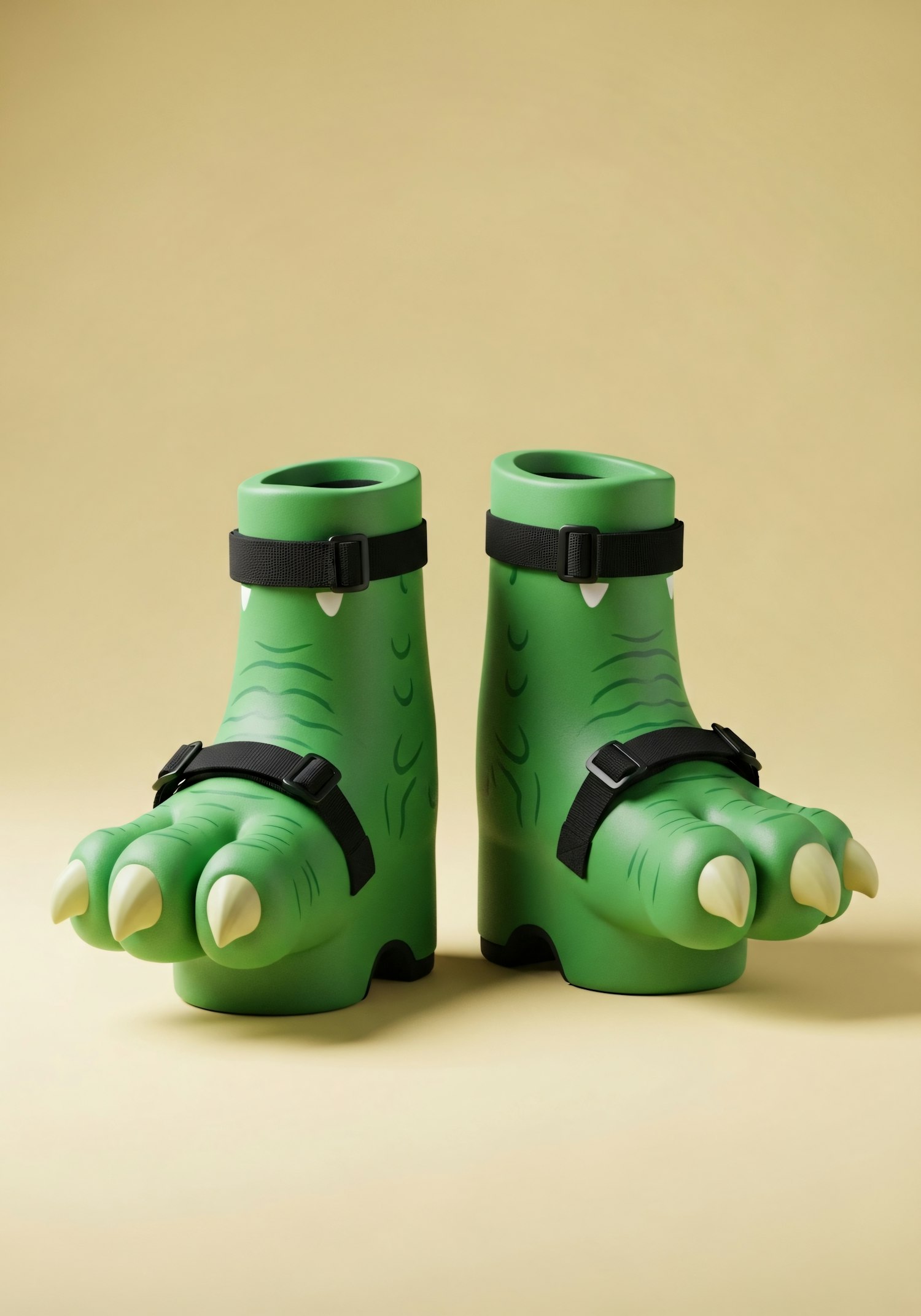 Fun green monster feet shoes with claws and black straps, perfect for costumes or playful occasions.