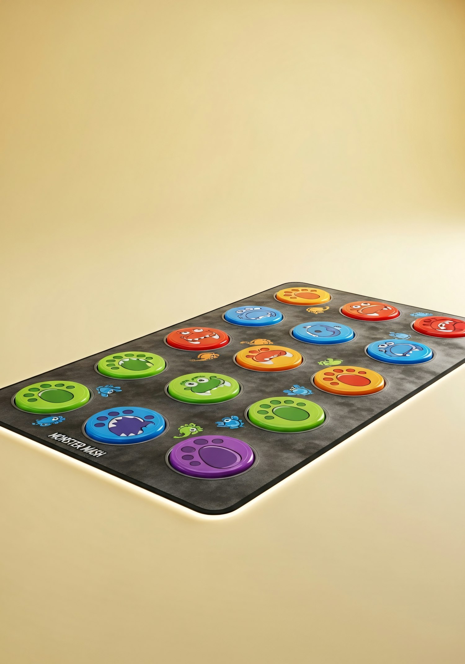 A vibrant game mat with colorful monster-themed buttons and paw prints, perfect for interactive play and fun activities.