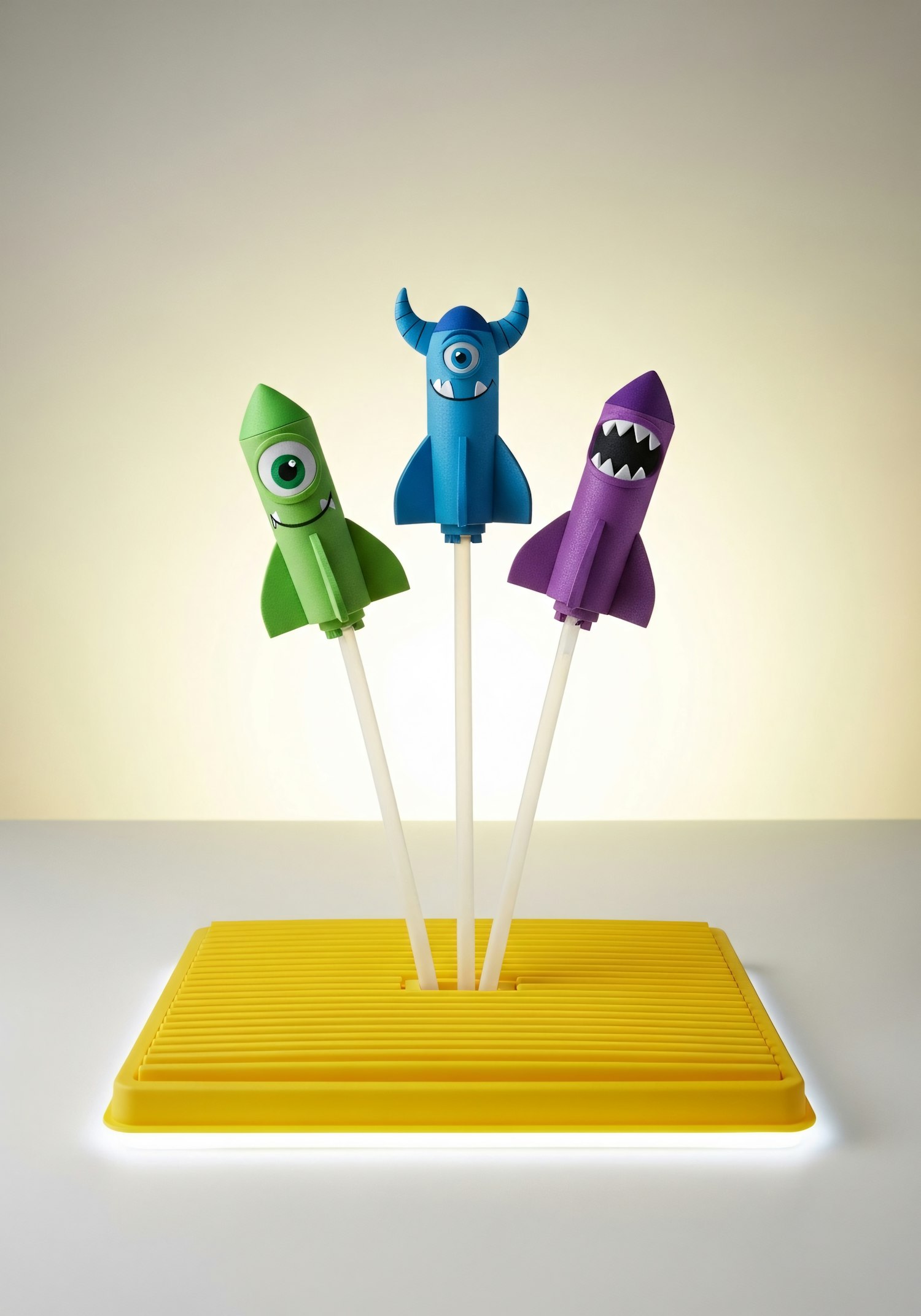 Three colorful monster-themed rocket popsicles on a yellow stand, featuring playful designs and a warm, inviting background.