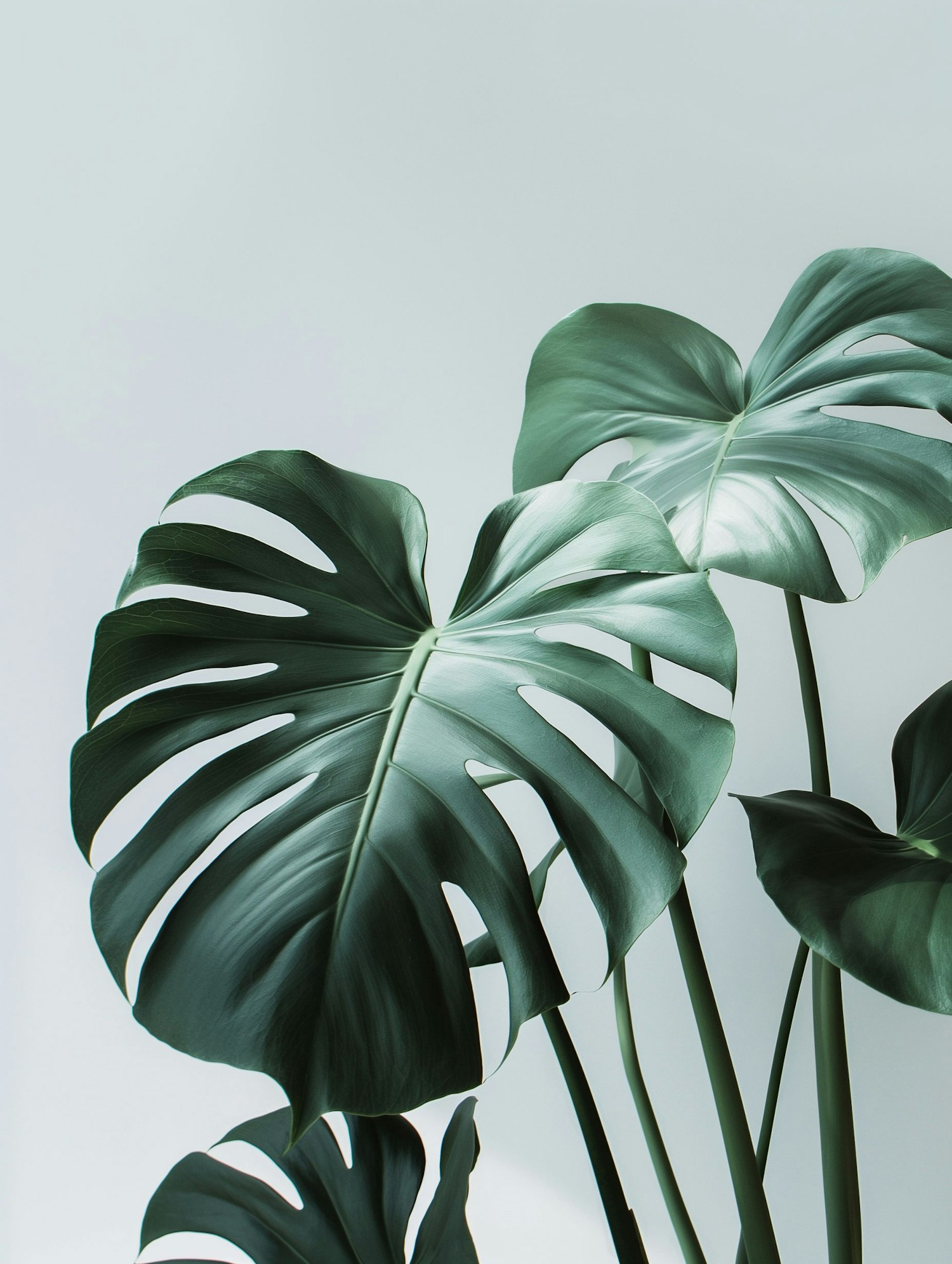 Lush green monstera leaves with iconic splits and perforations against a soft background, creating a serene and elegant composition.