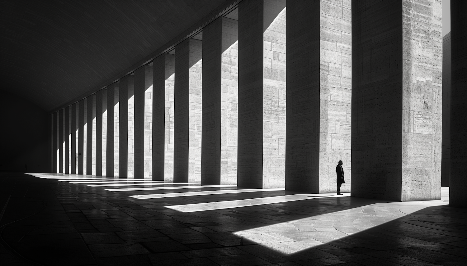 A lone figure stands amidst towering columns, casting dramatic shadows in a vast, modern architectural space.