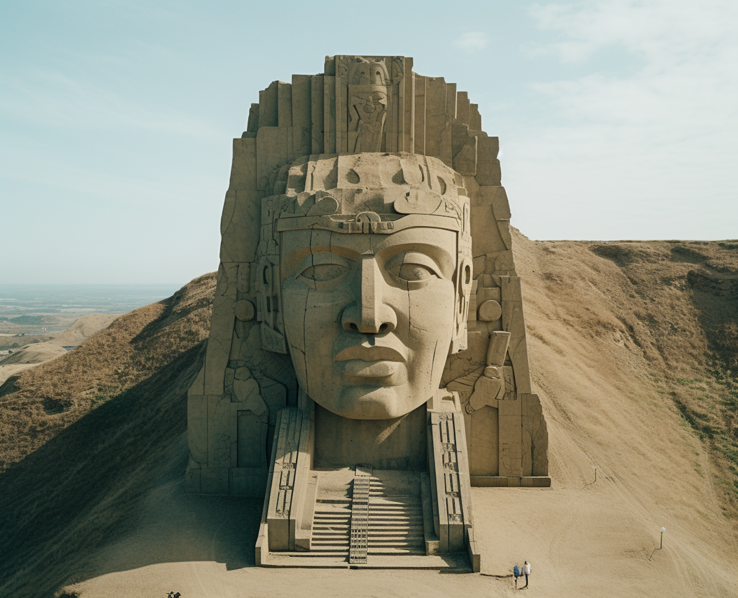 Majestic stone face sculpture carved into a hillside, with intricate patterns and two people for scale, under a clear blue sky.