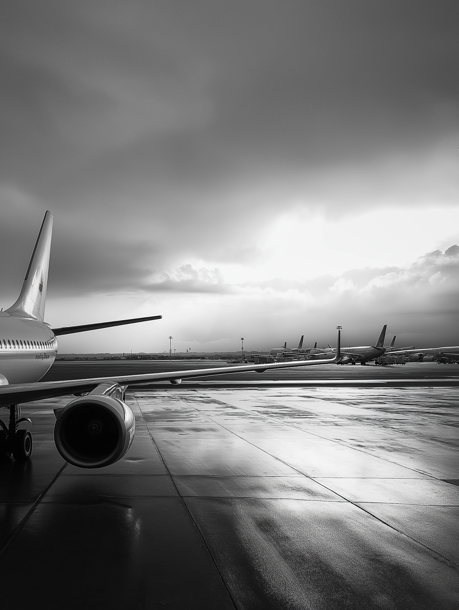 A moody black-and-white airport scene with planes on a wet tarmac under dramatic clouds and light breaking through.