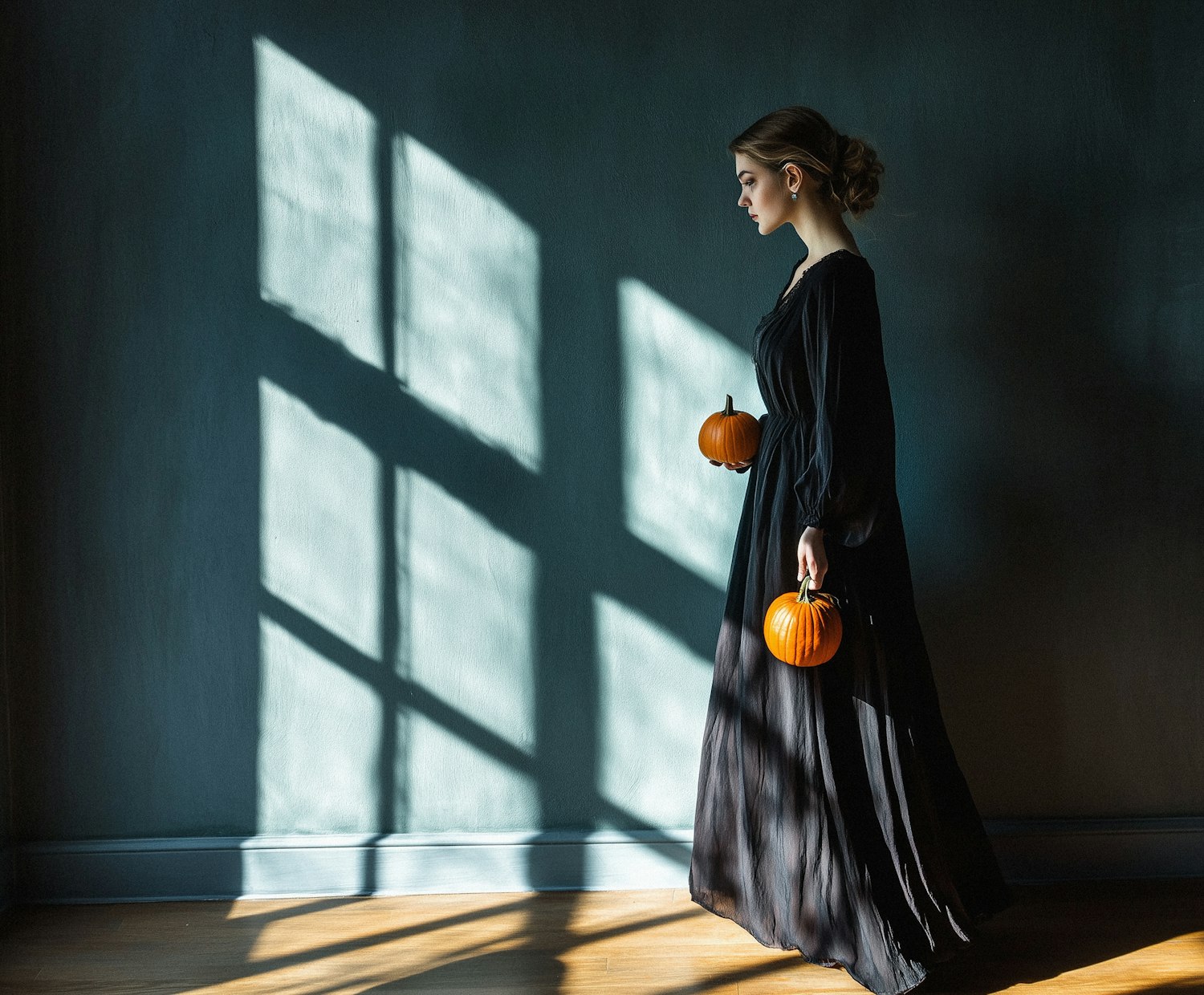 A woman in a black dress holds pumpkins, standing in sunlight with geometric shadows on a blue wall, creating a serene autumn scene.