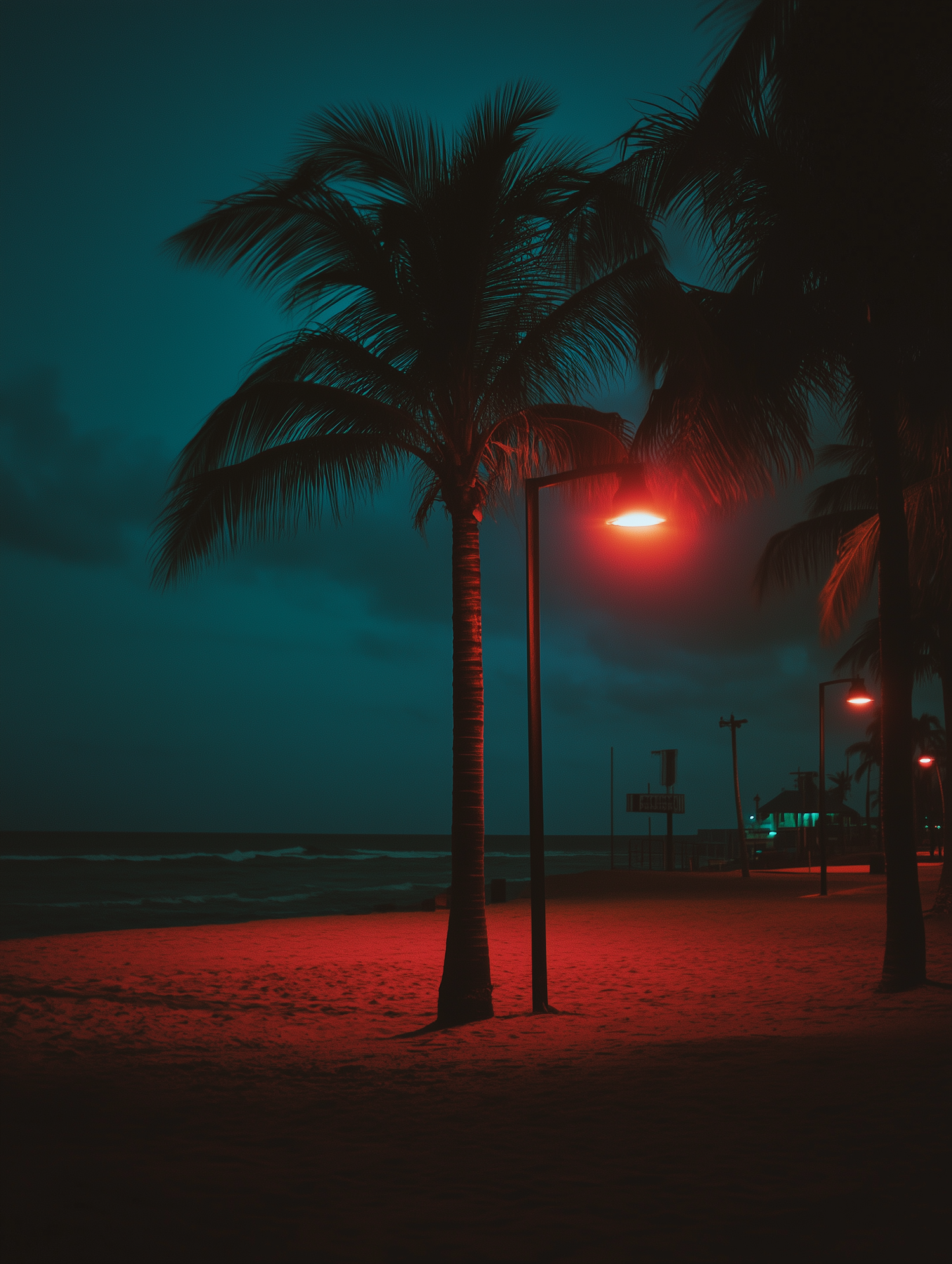 A moody nighttime beach scene with palm trees, red streetlights, and a teal sky, creating a cinematic and tranquil atmosphere.