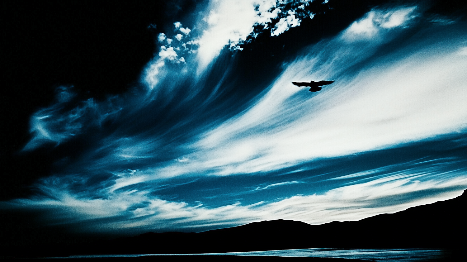 A silhouetted bird soars under a dramatic blue sky with streaked clouds, above a dark mountain horizon and reflective water.