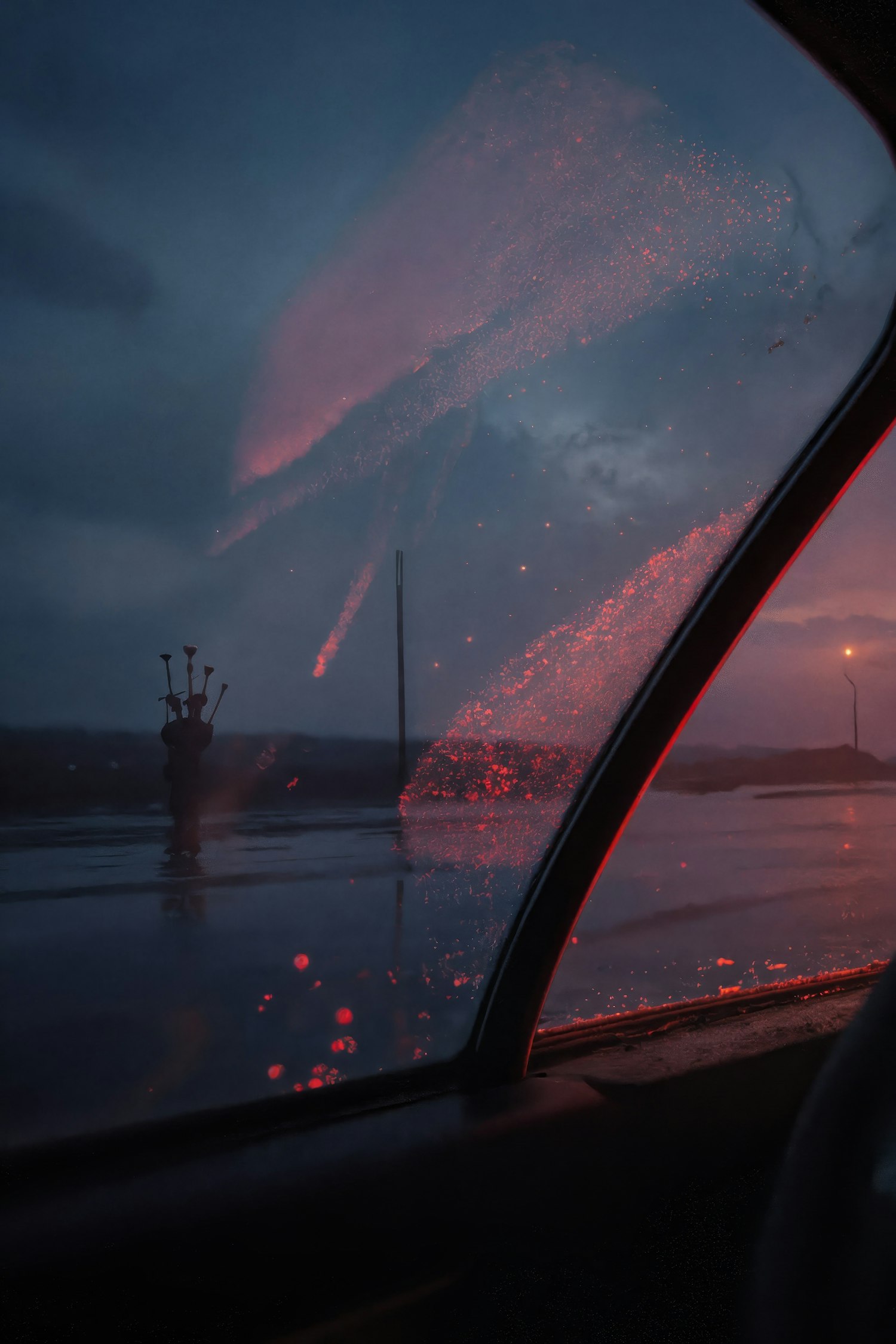 Moody view from a car window with water streaks, a silhouetted figure, and a glowing streetlamp under a dramatic dusk sky.