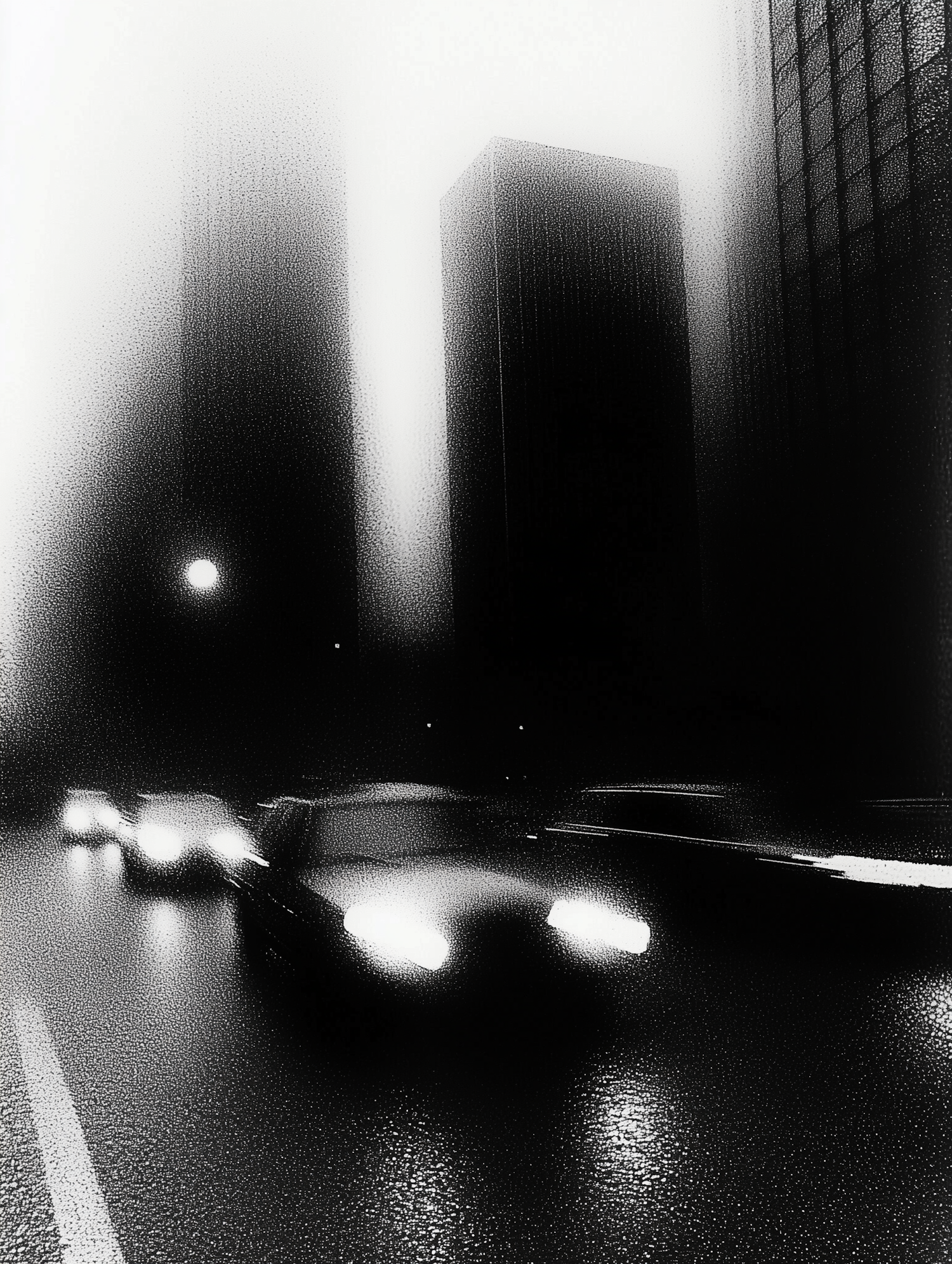 Moody black and white cityscape with fog, skyscrapers, and blurred cars on a wet road, creating a mysterious nighttime atmosphere.