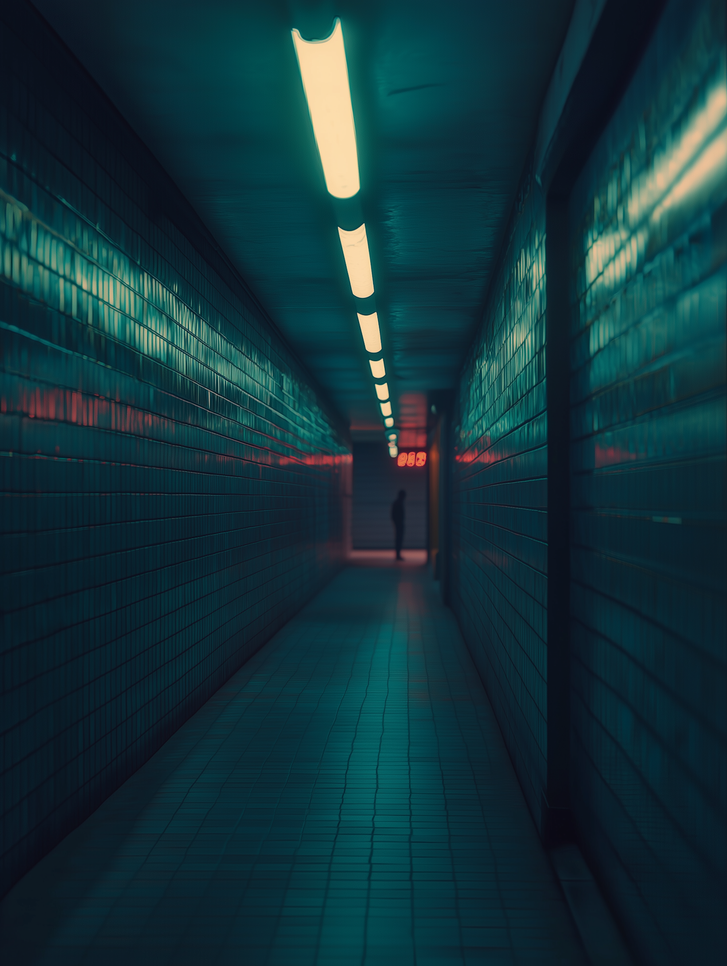 Moody underground corridor with teal lighting, reflective tiles, and a silhouetted figure at the end, creating a cinematic atmosphere.