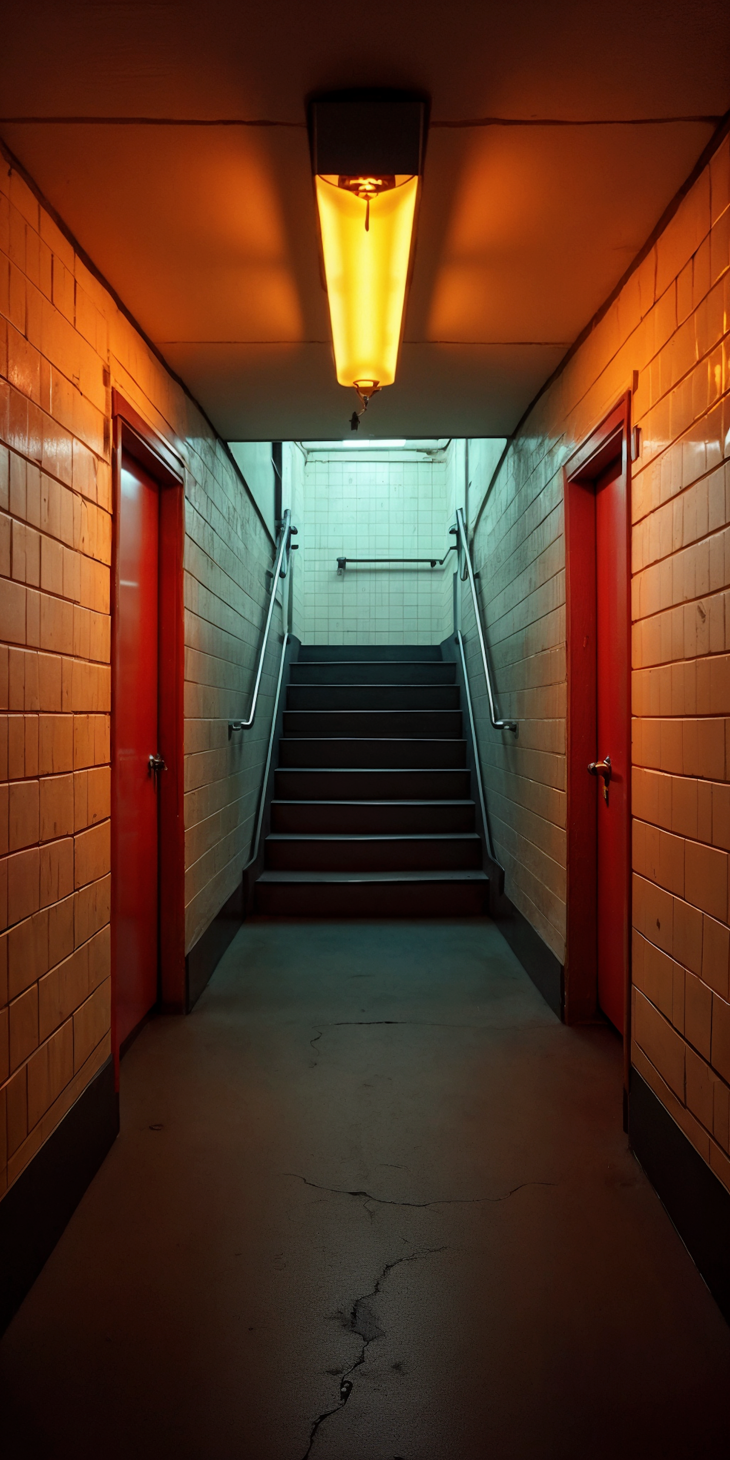 A dimly lit corridor with orange walls, red doors, and a staircase leading to a brighter area, creating a mysterious atmosphere.