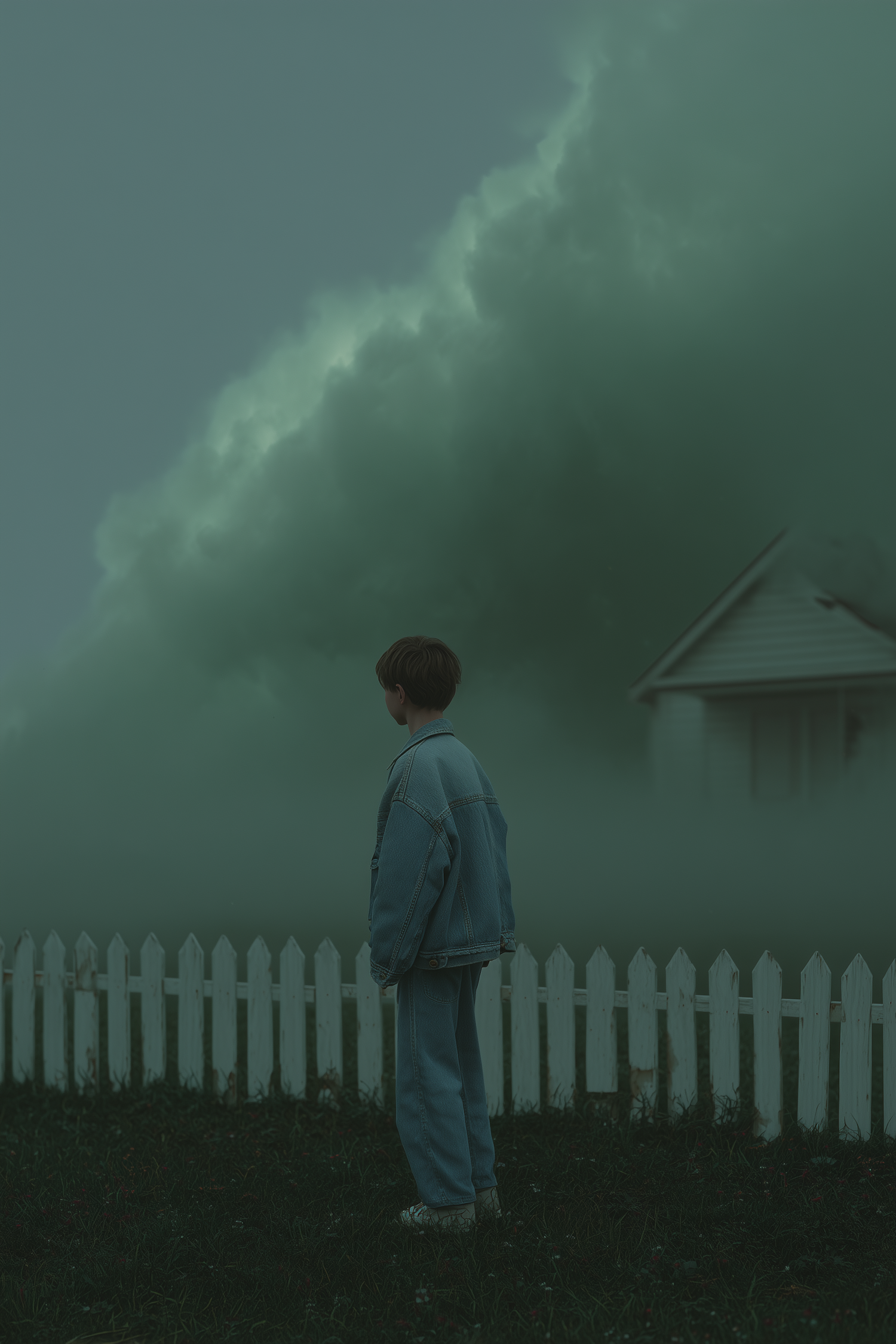 A person in denim stands by a white picket fence, facing a house shrouded in green fog, creating a mysterious and surreal atmosphere.