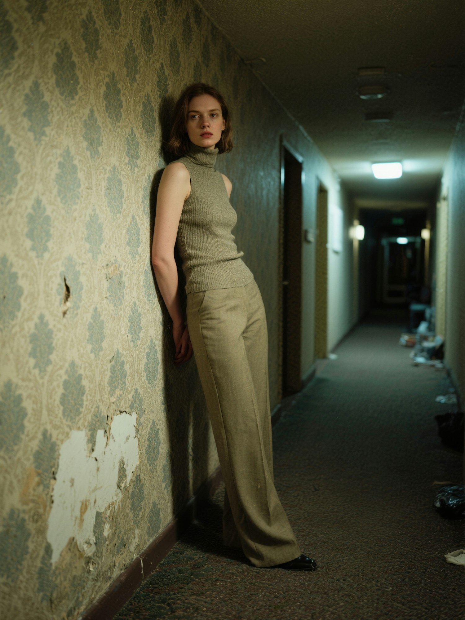 A woman in a beige outfit leans against a worn wall in a dimly lit hallway with peeling wallpaper and scattered debris.
