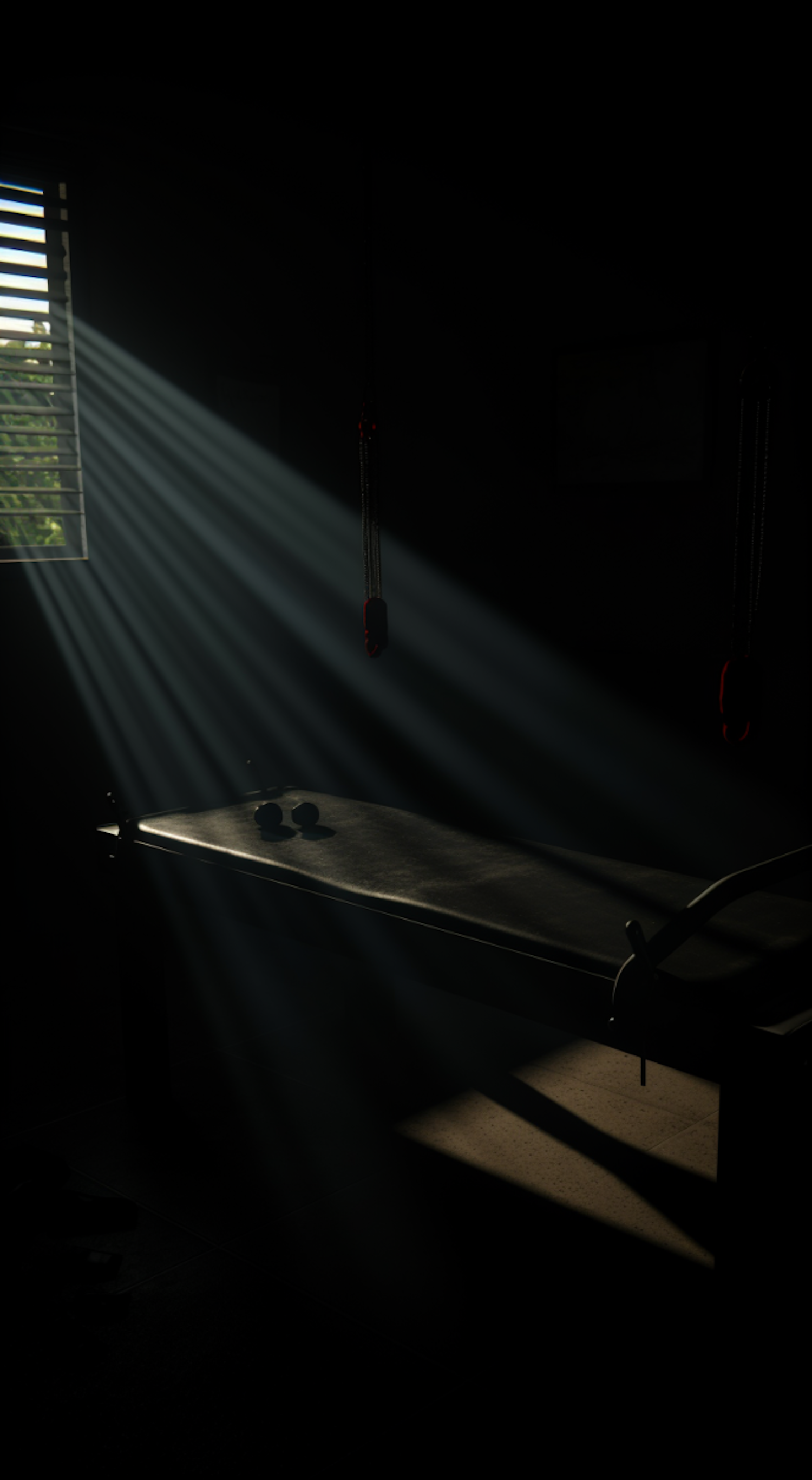 Sunlight streams through blinds, casting shadows on a table with two spheres in a dimly lit room, creating a mysterious atmosphere.