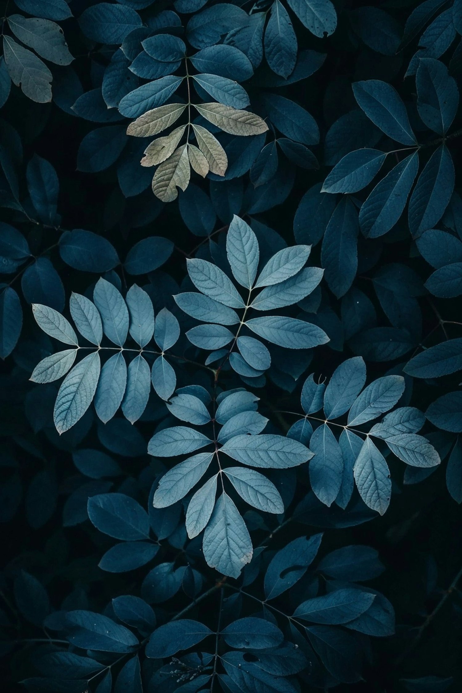 A serene arrangement of blue and teal leaves with a standout golden leaf, creating a tranquil and textured natural pattern.