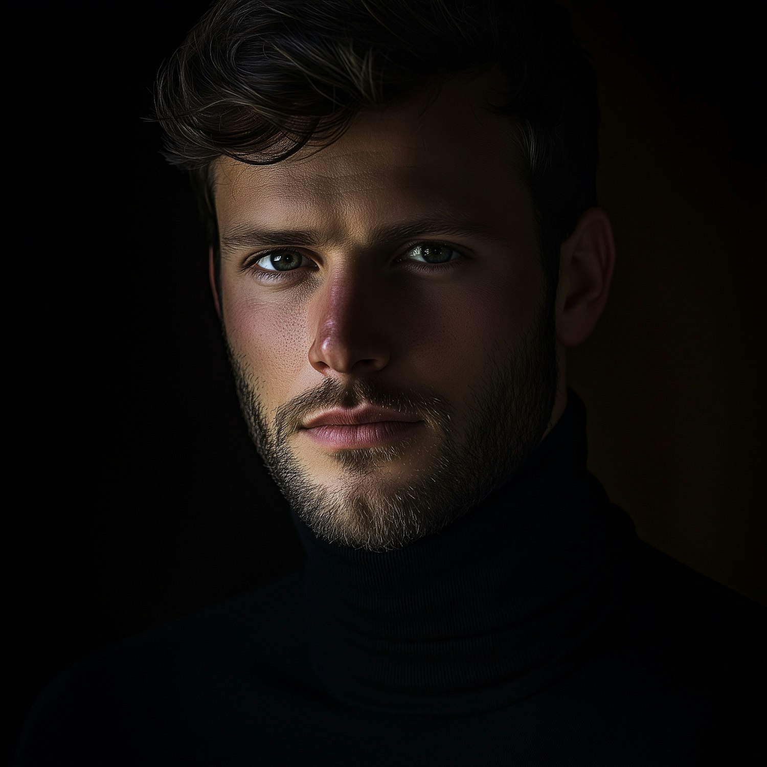 Close-up of a man with green eyes, dark brown hair, and a beard, wearing a black turtleneck against a dark background.