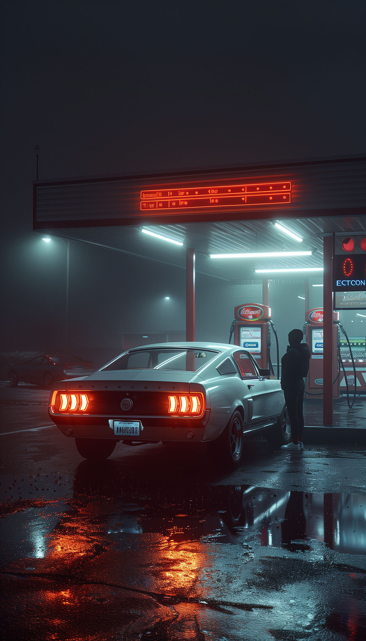 Classic car at a neon-lit gas station at night, with misty reflections on wet pavement and a mysterious hooded figure.