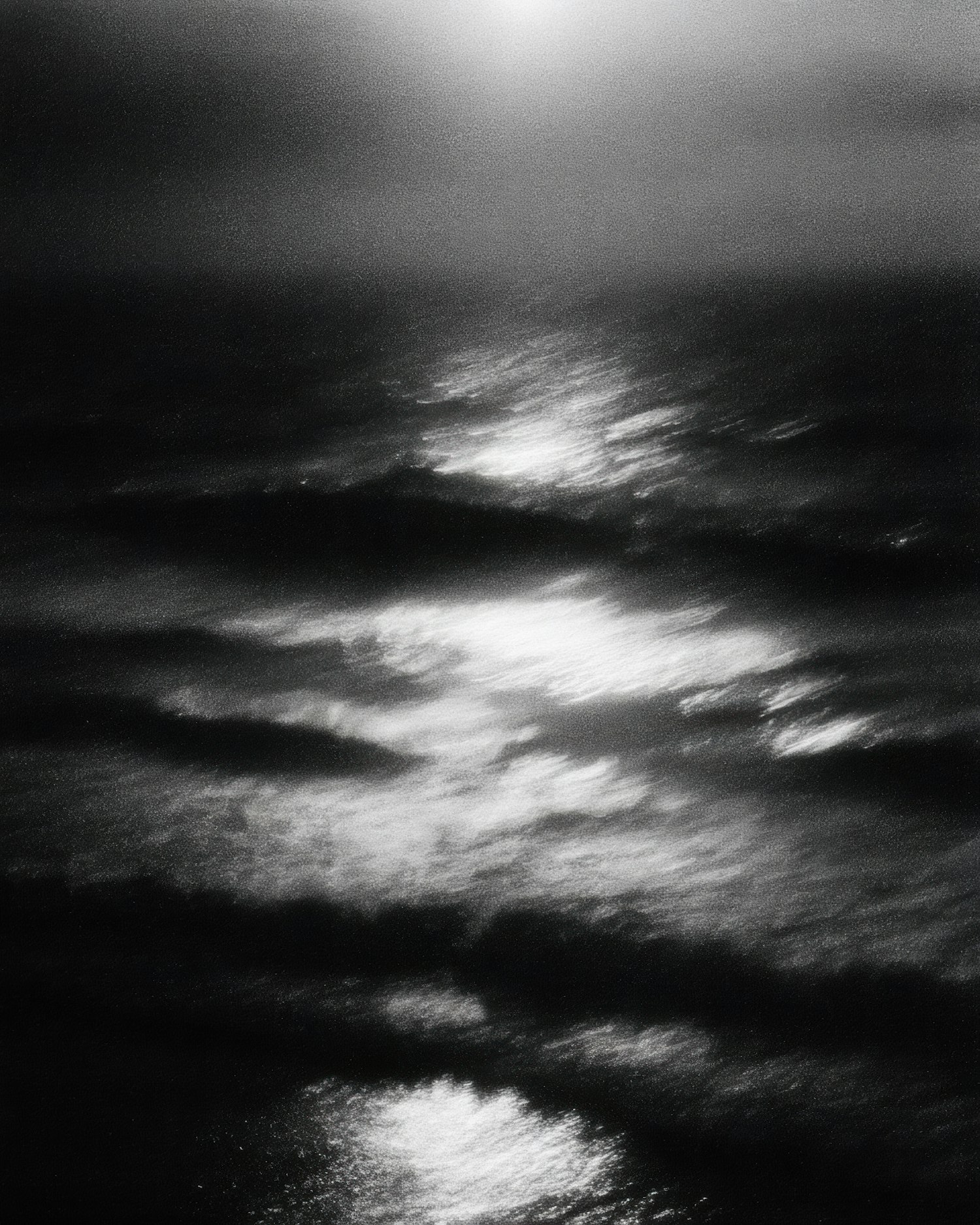 Moody black-and-white seascape with moonlight reflecting on blurred waves, creating a dramatic and atmospheric nighttime scene.