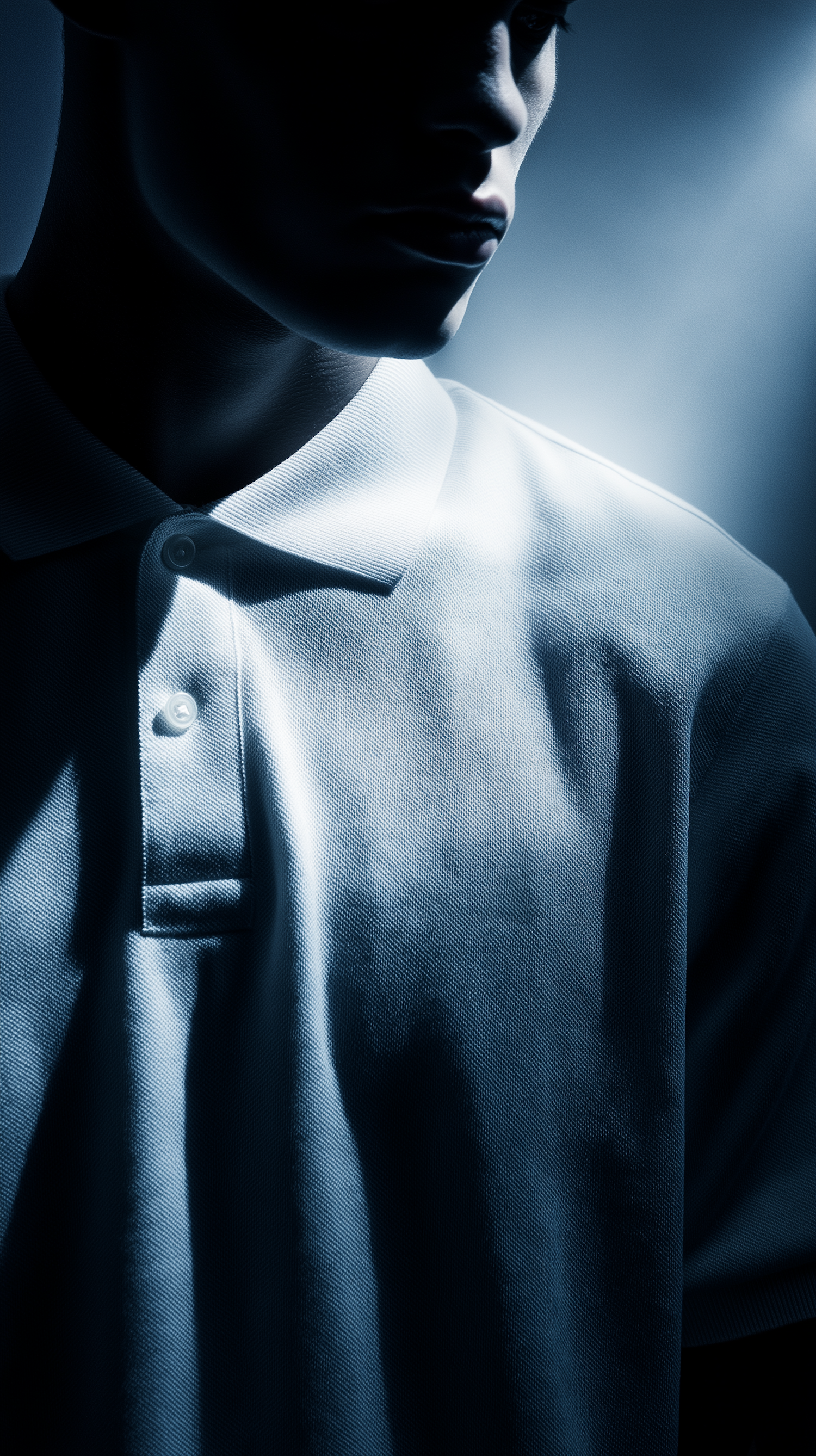 Moody close-up of a person in a textured white polo shirt, with dramatic lighting and a soft blue gradient background.
