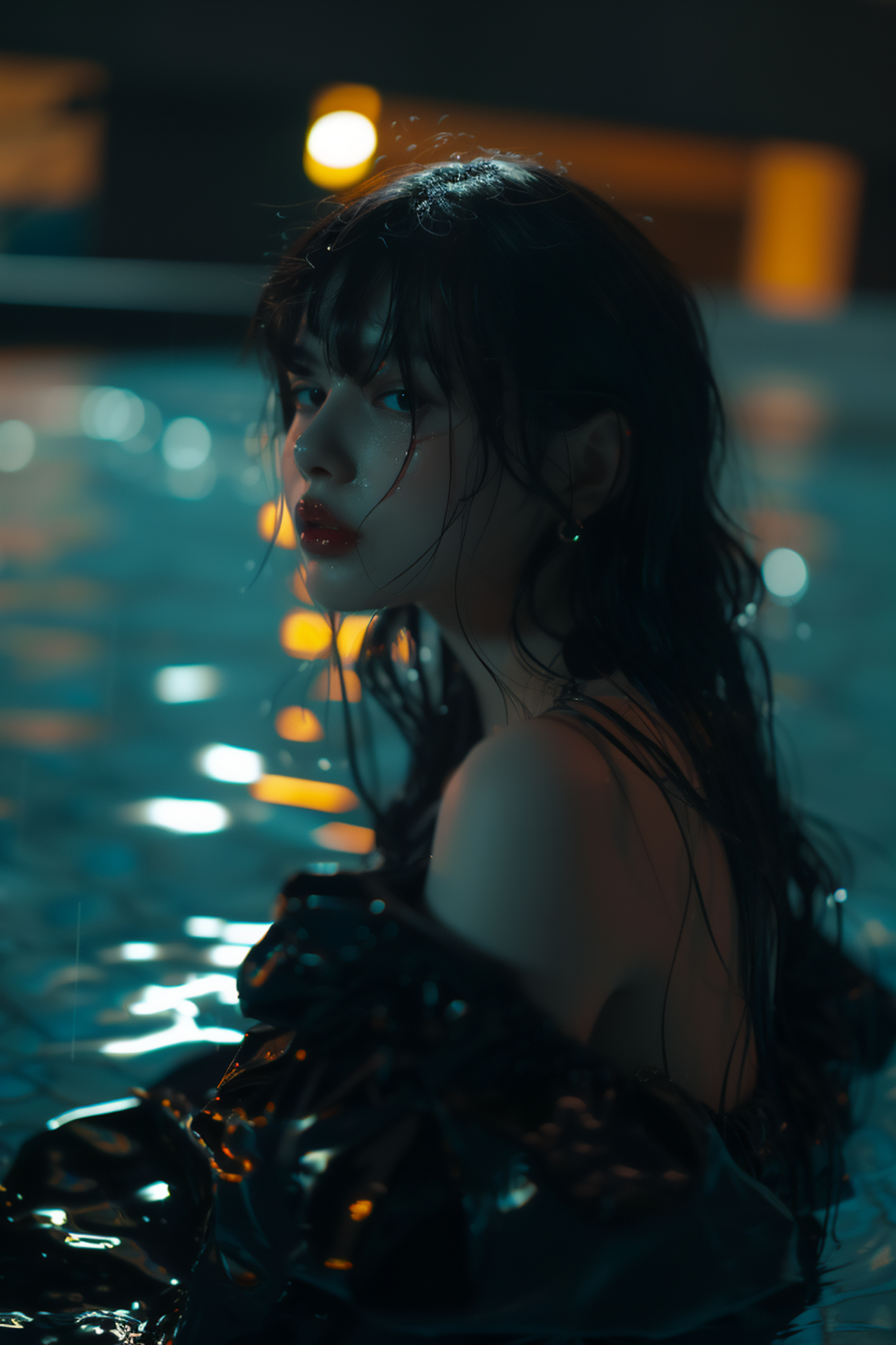 Moody nighttime poolside portrait of a woman with wet hair and reflective lighting, creating a cinematic and dramatic vibe.