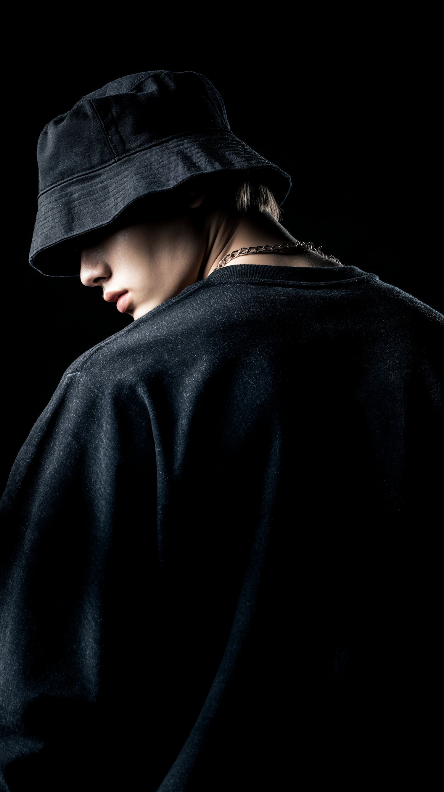 Moody portrait of a person in a black bucket hat, dark shirt, and silver chain necklace against a black background.