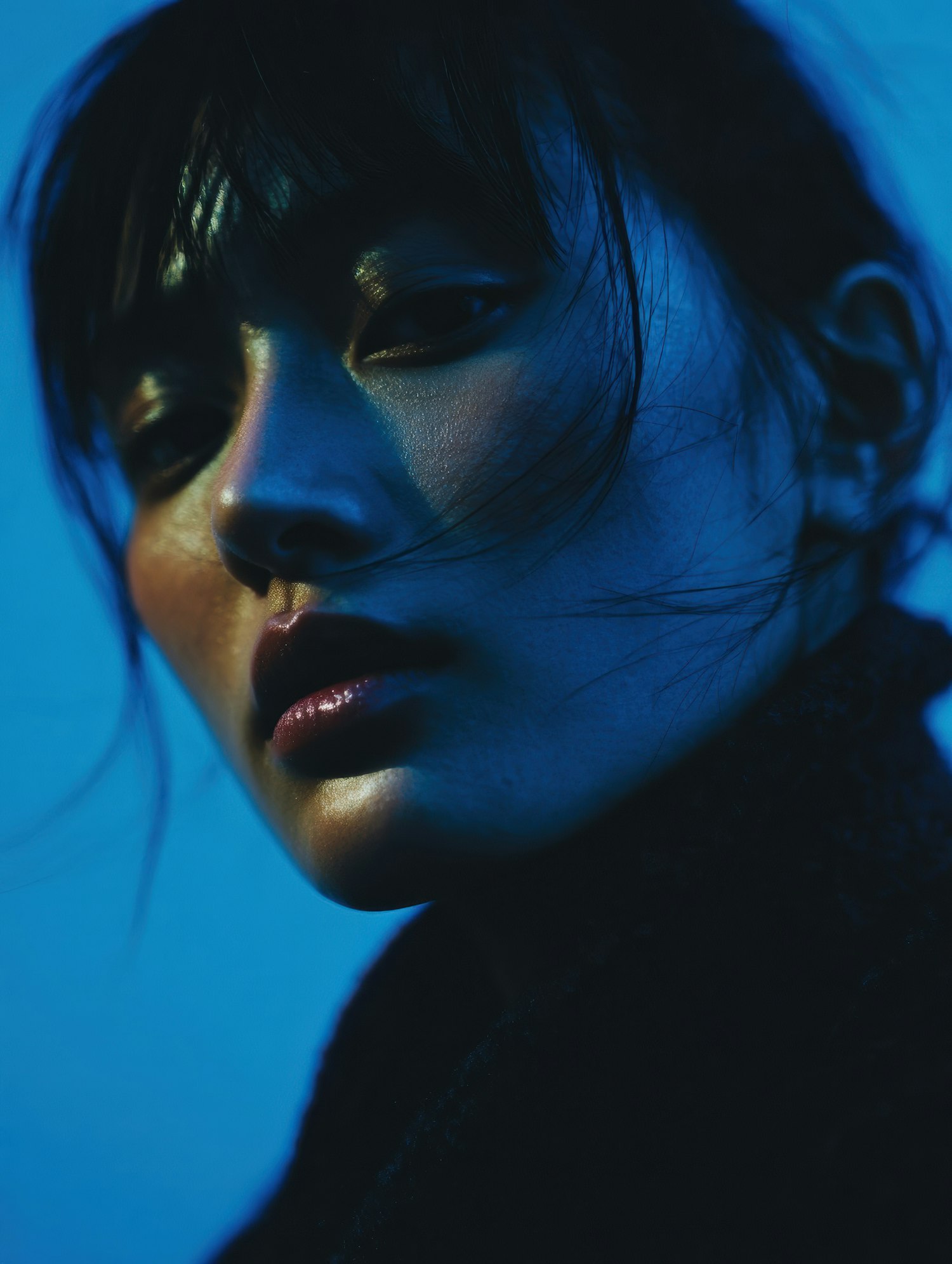 Moody close-up portrait with dramatic blue and yellow lighting, highlighting the subject's features against a gradient blue background.