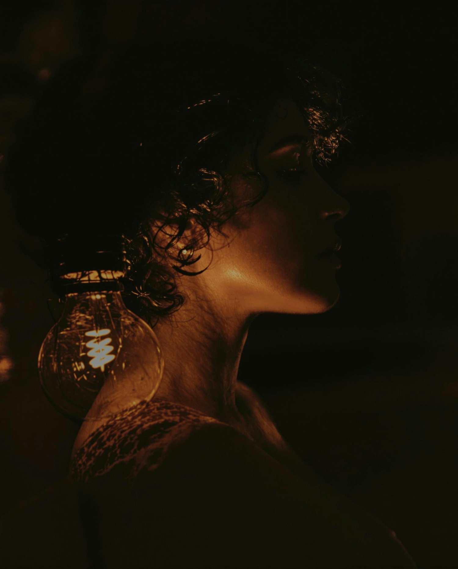 Moody portrait with warm lighting from a filament bulb, highlighting curly hair and soft facial features against a dark background.
