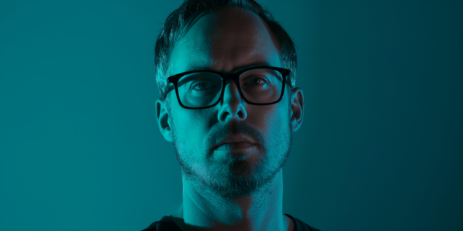 Portrait of a man with glasses in dramatic teal lighting, creating a moody and intense atmosphere.