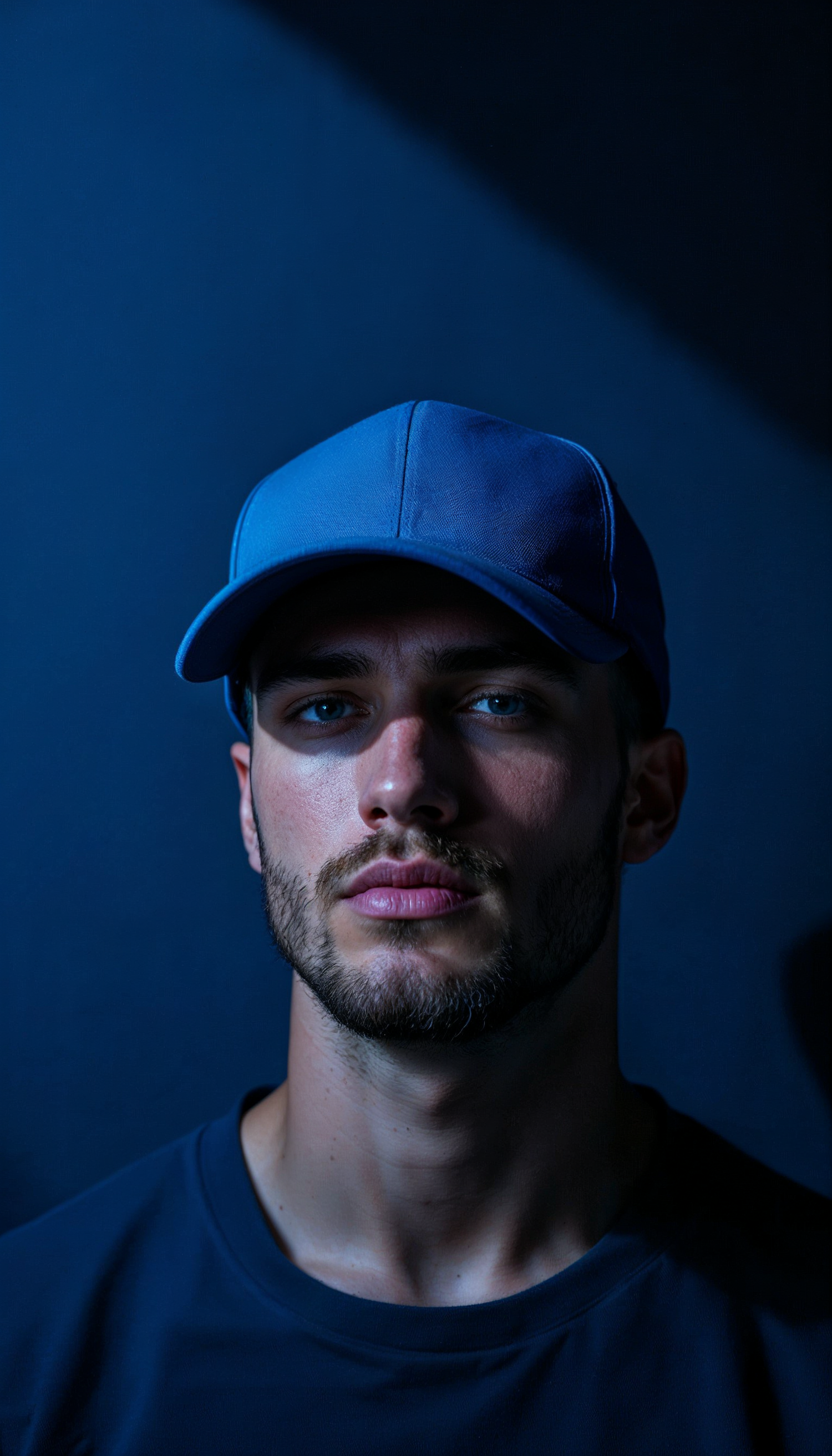 Portrait of a young man in a blue cap and shirt, with a short beard, against a deep blue background.
