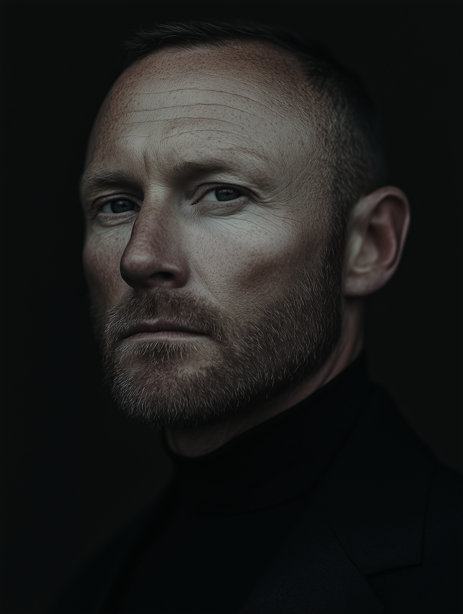 Close-up portrait of a serious Caucasian man with blue eyes and a beard, wearing a black turtleneck against a dark background.