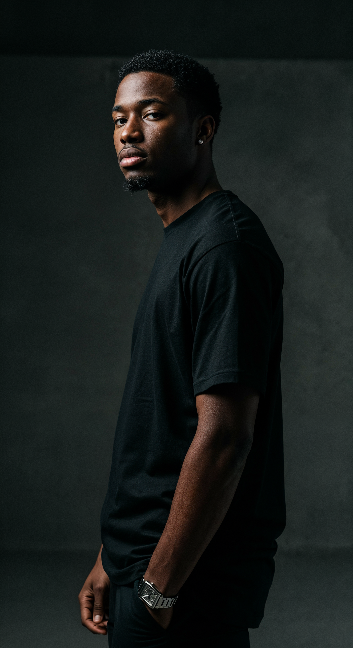 A young man in a black T-shirt and silver watch stands confidently in a dimly lit setting with a dark gray background.