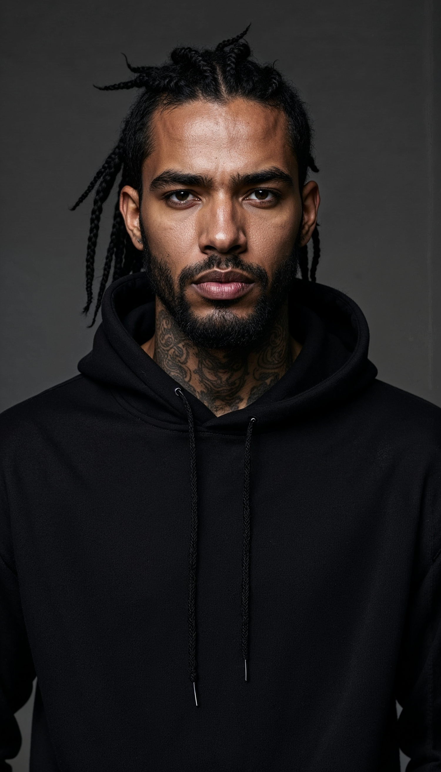 Portrait of a man with braids and a beard in a black hoodie, showcasing a serious expression and neck tattoo.