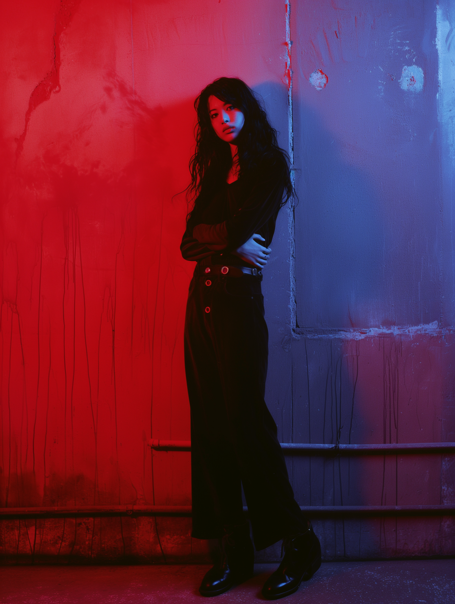 Moody portrait of a woman in black attire under dramatic red and blue lighting, set against an industrial-style wall.