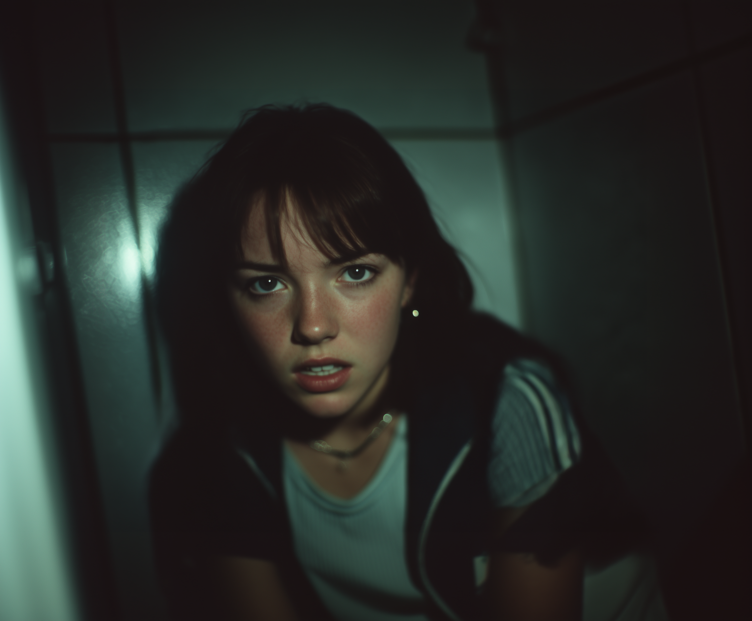 A young woman with dark hair and freckles sits in a dimly lit, tiled space, her intense expression highlighted by dramatic shadows.