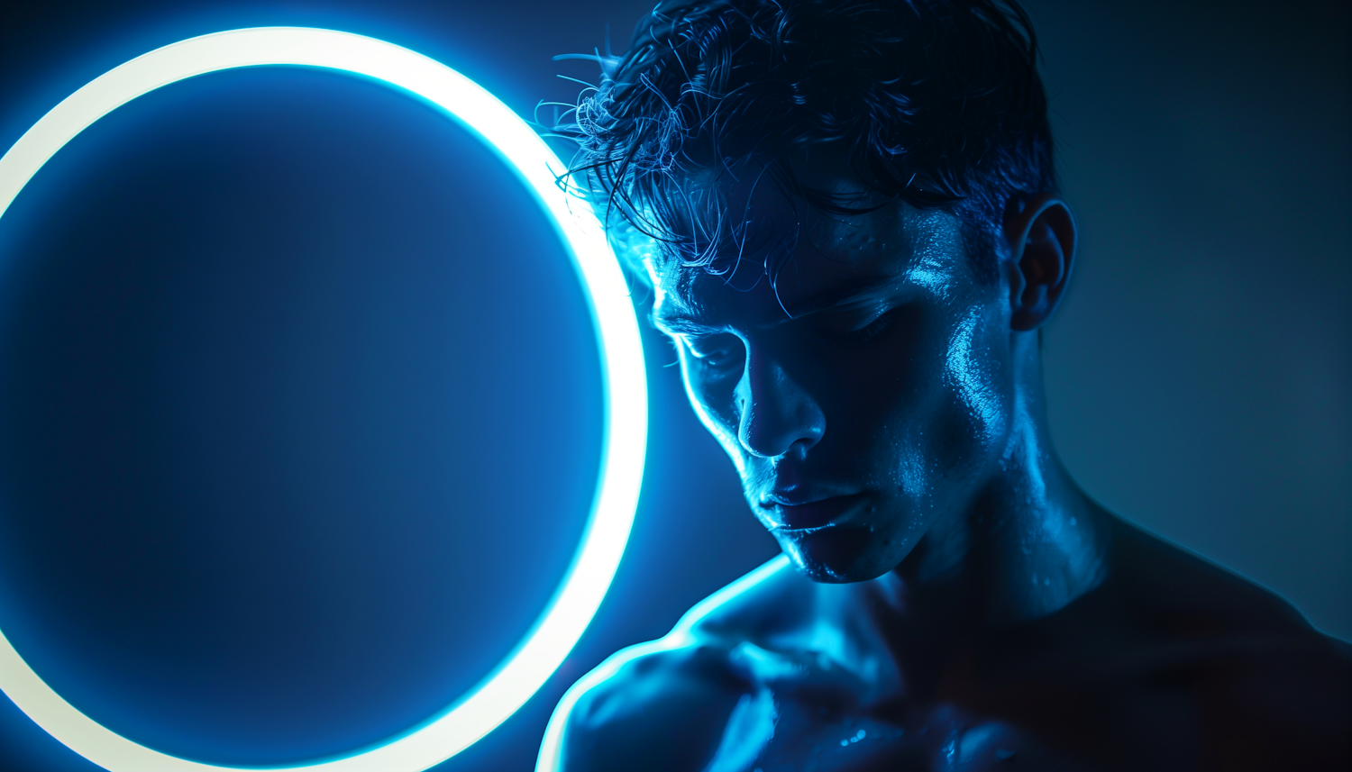 Moody portrait of a young man illuminated by a blue neon circle, creating a futuristic and intense atmosphere.