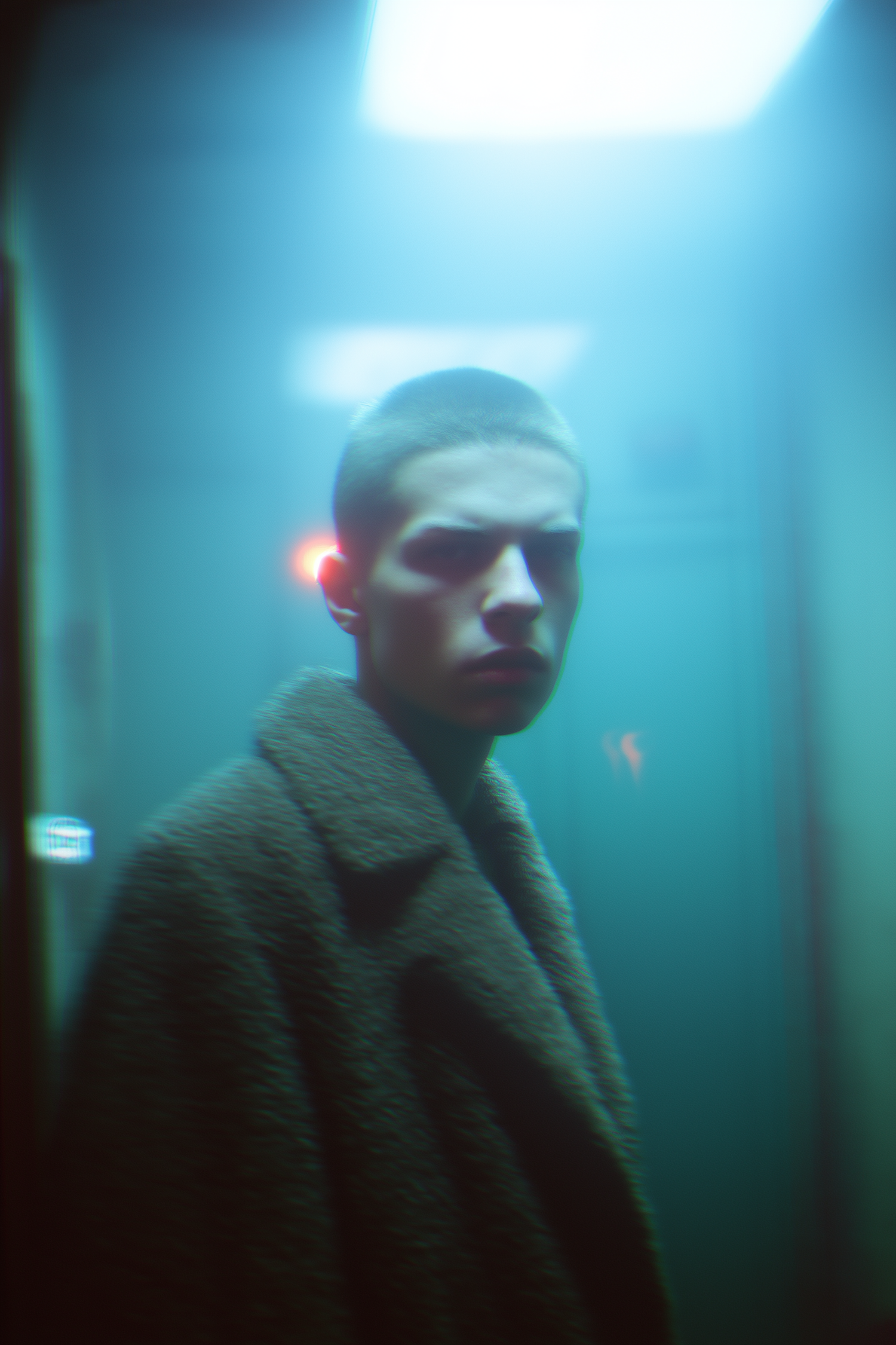 A moody portrait of a person in a textured coat, set against a dim, blue-green background with soft lighting and a red accent light.