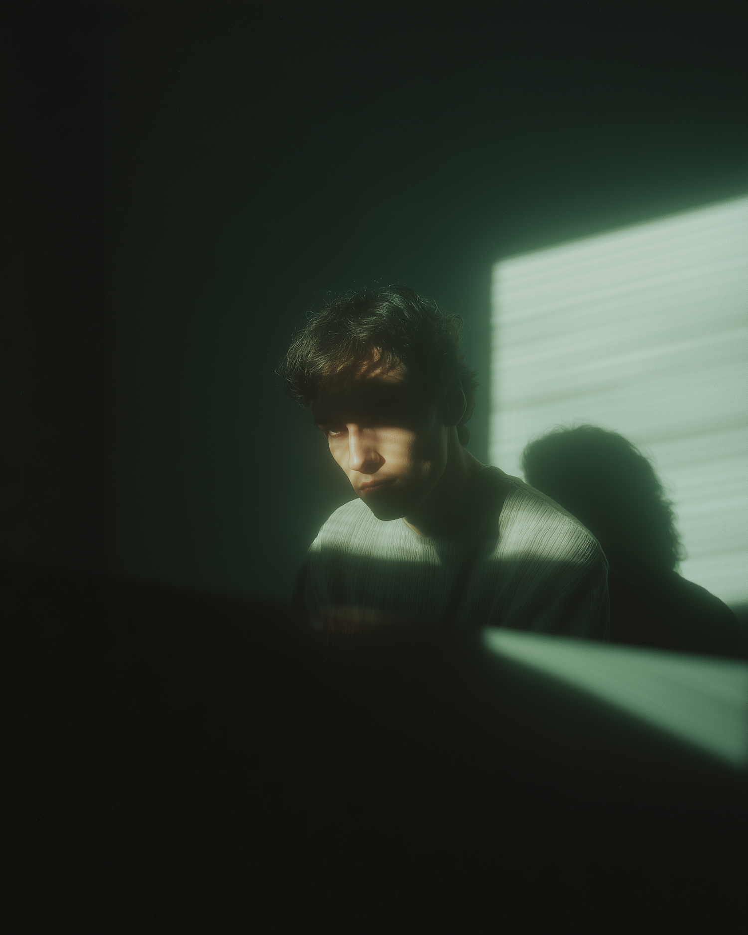 Moody portrait of a person in soft light through blinds, creating dramatic shadows and a contemplative atmosphere.