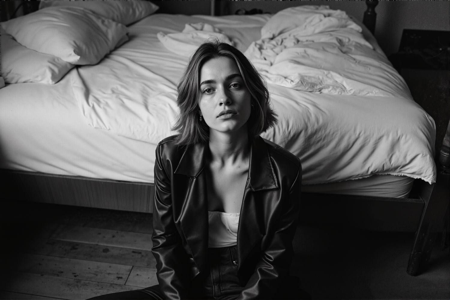 Black-and-white portrait of a woman in a leather jacket sitting on the floor, with an unmade bed in the background.