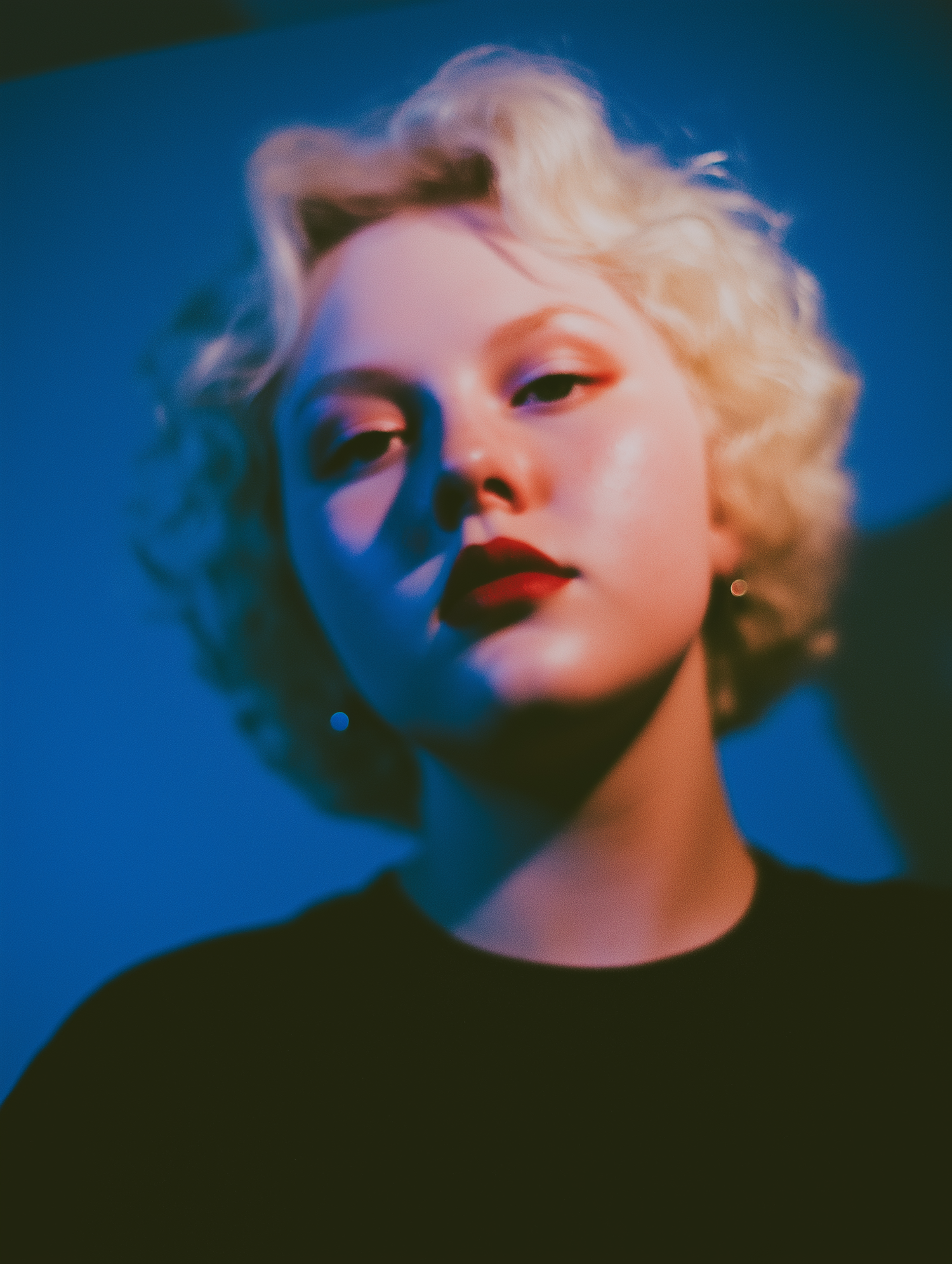 Artistic portrait of a person with blonde curls and dramatic lighting, set against a blue background, creating a moody and soft focus effect.