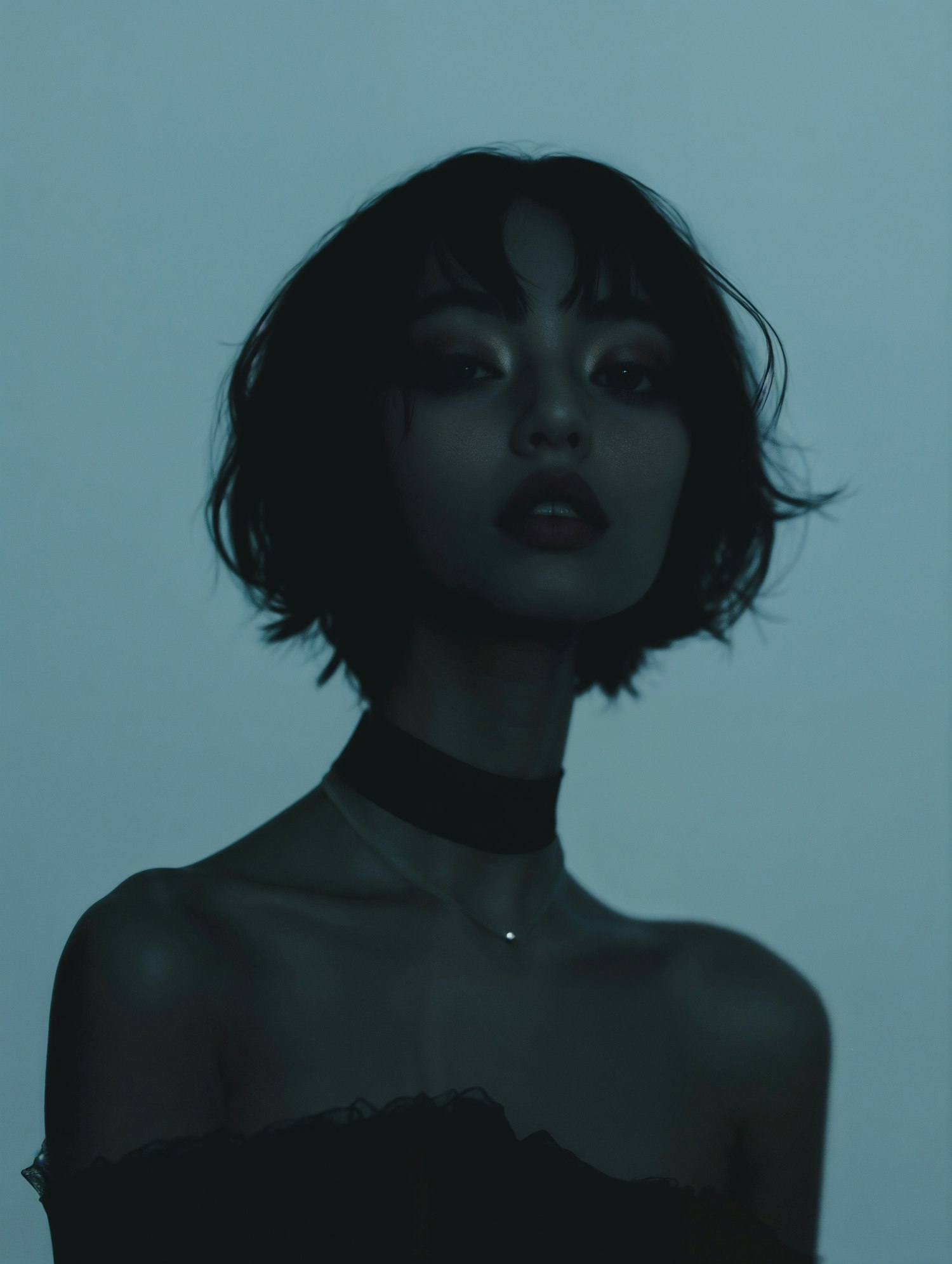 Moody portrait of a young woman with short black hair, wearing a choker and necklace, set against a muted blue background.