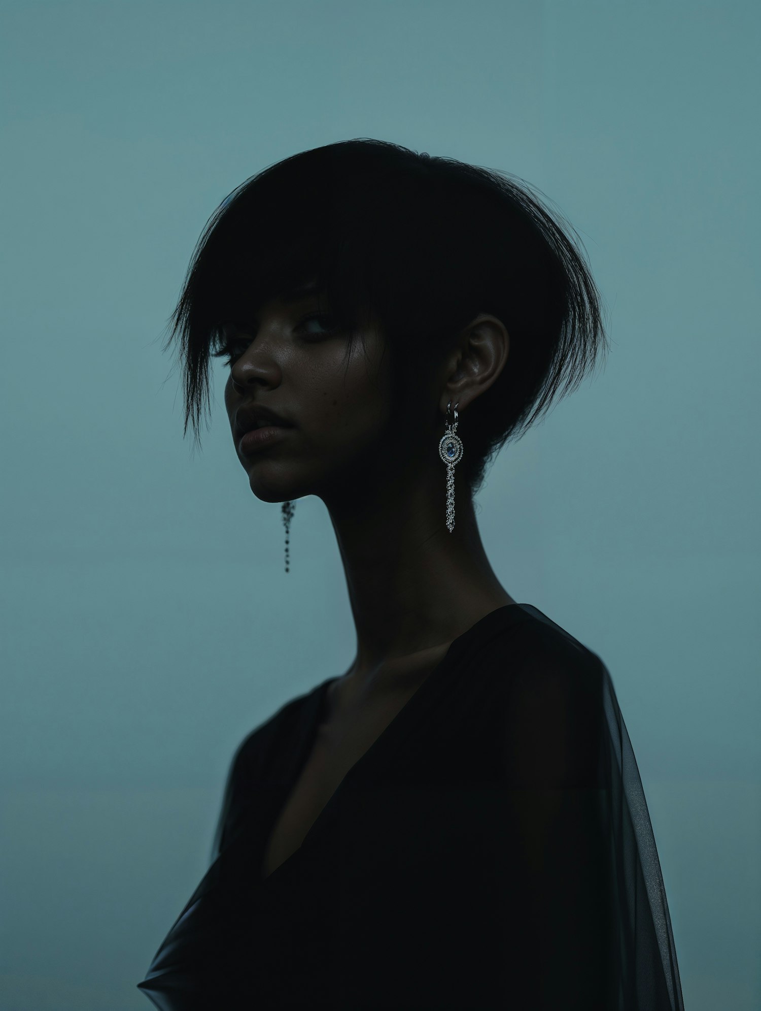 Elegant portrait of a woman with short hair and sparkling earrings against a muted blue background, exuding calm and sophistication.