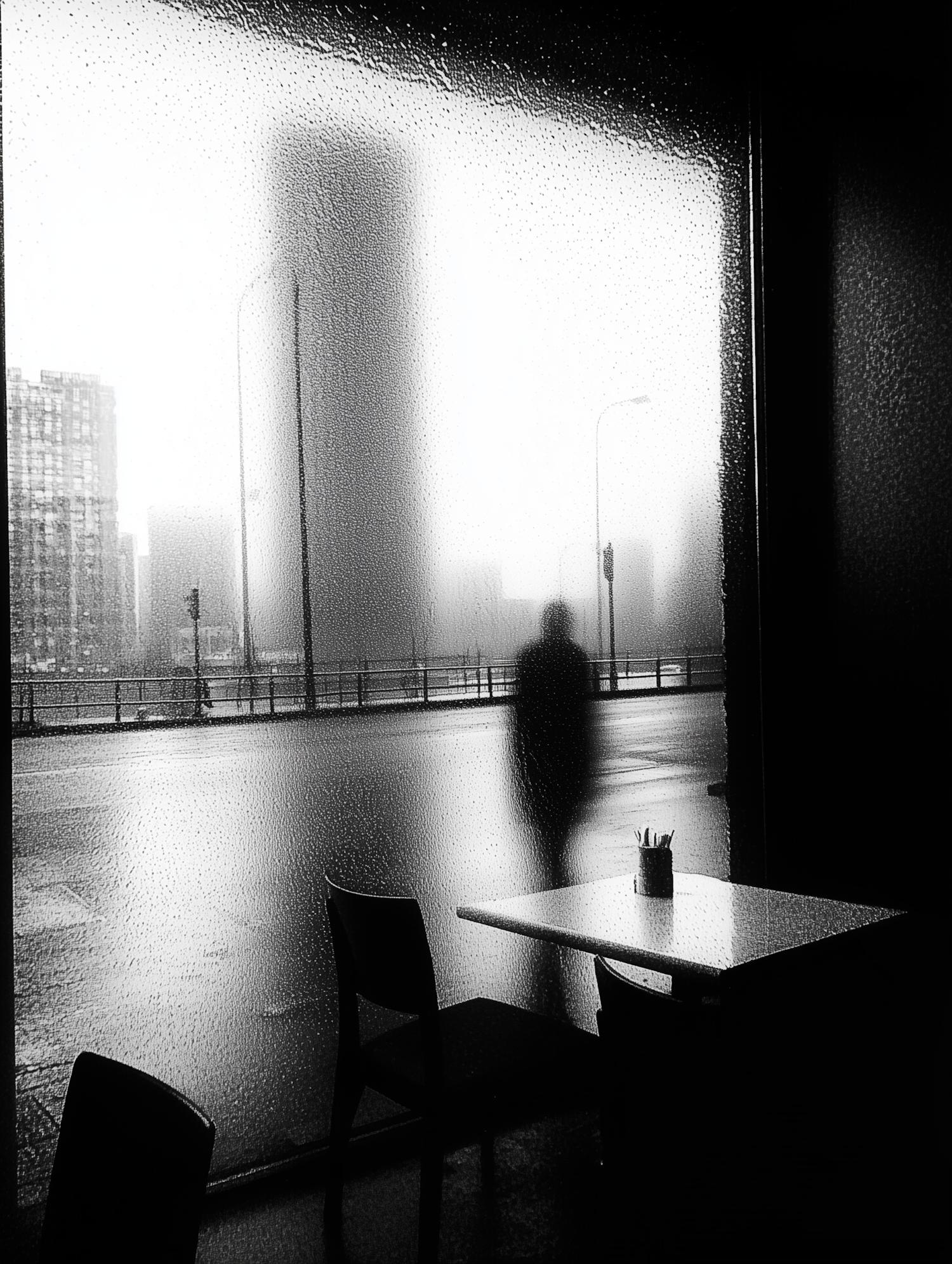 Moody black and white photo of a rainy cityscape viewed through a window, with a blurred silhouette and urban ambiance.