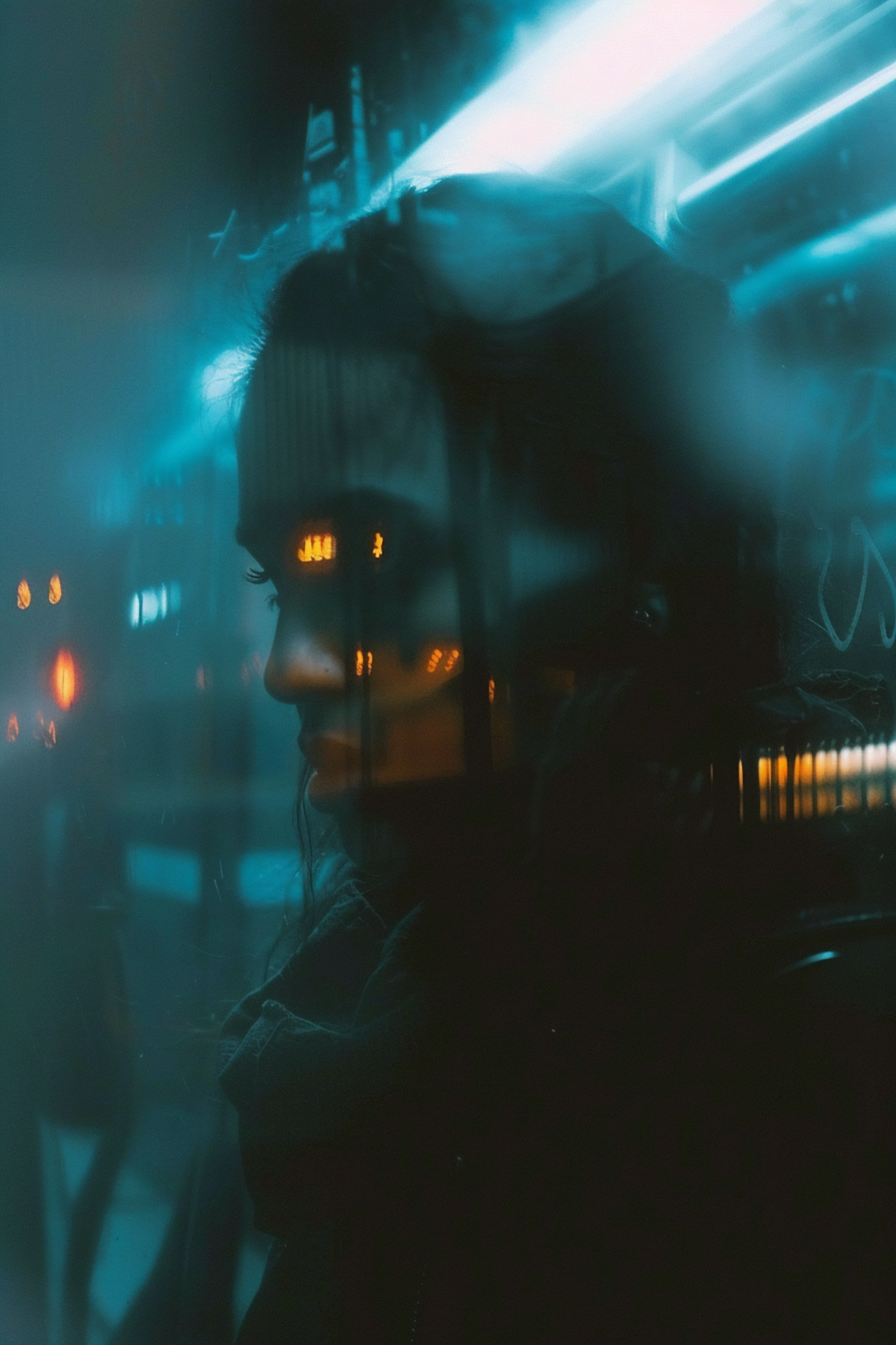 Moody side profile of a person with neon reflections, blending blue and orange lights for a cinematic, mysterious vibe.