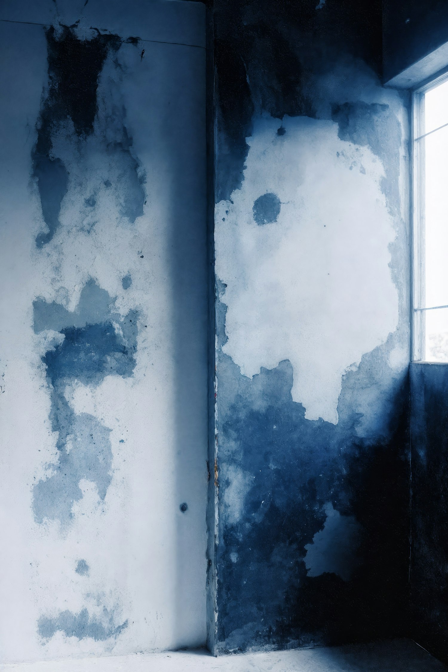 A moody, blue-tinted photo of a weathered room corner with peeling paint and water stains, illuminated by soft natural light.