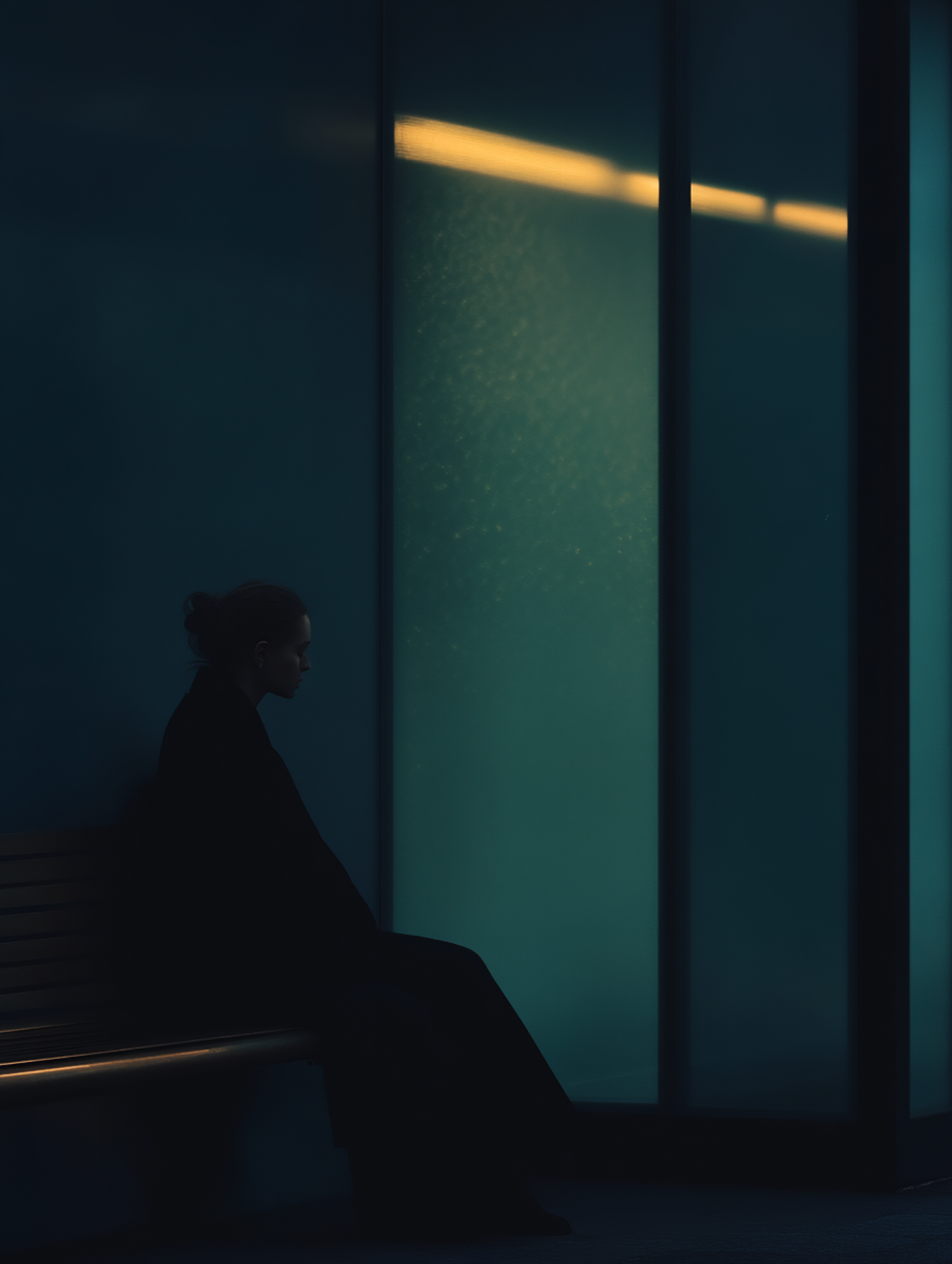 Moody silhouette of a person sitting on a bench against teal glass, with soft yellow light creating a serene, introspective vibe.