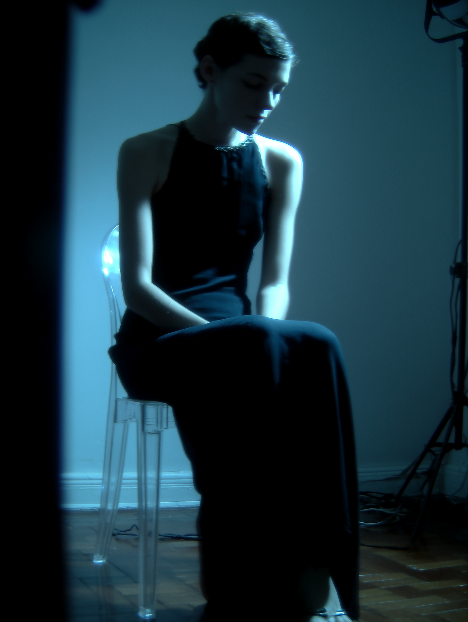 A person in a dark dress sits on a transparent chair in a dimly lit, blue-toned room, creating a serene and introspective mood.