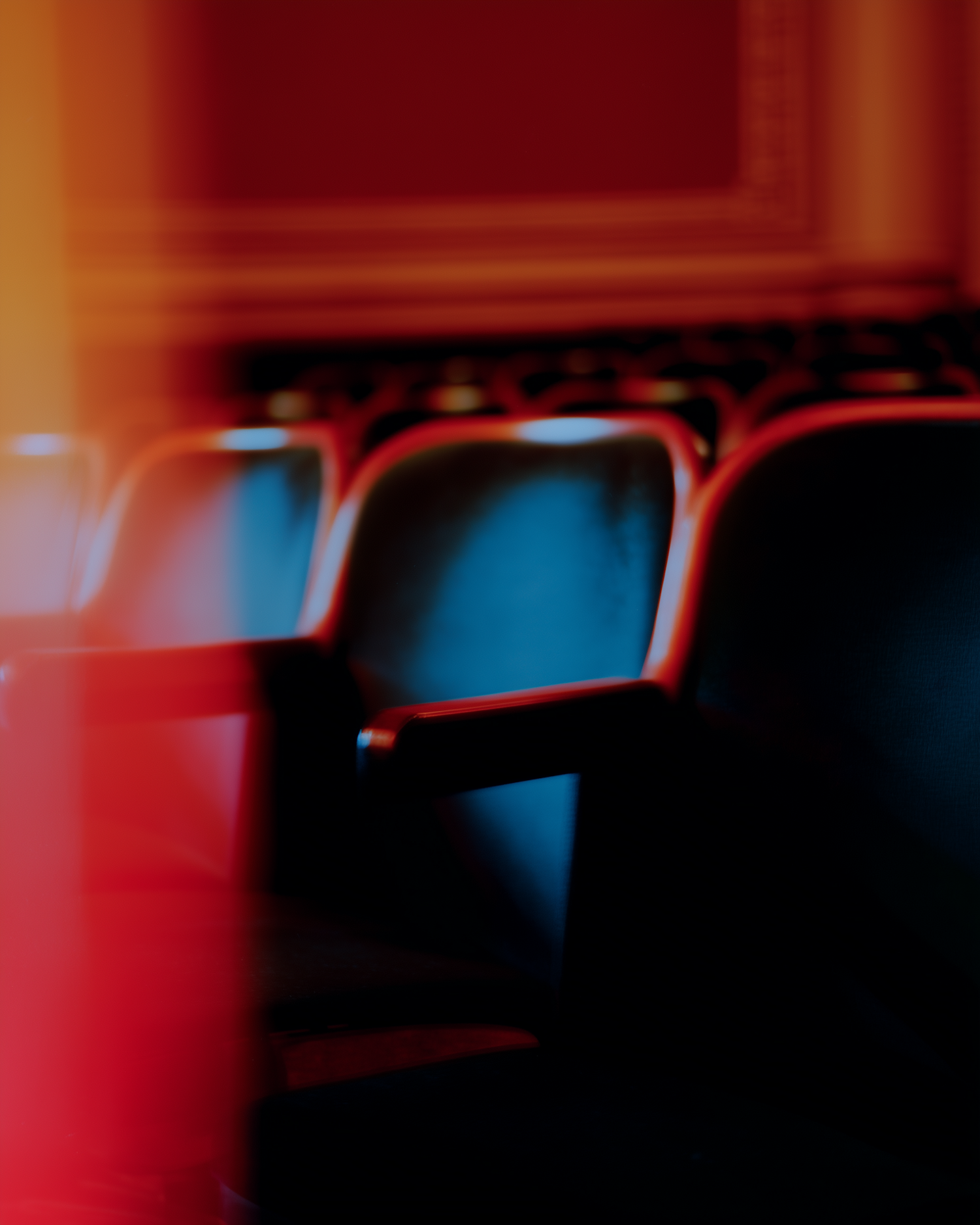Moody theater seating with dramatic lighting, blending warm orange and cool blue tones for an artistic, cinematic vibe.