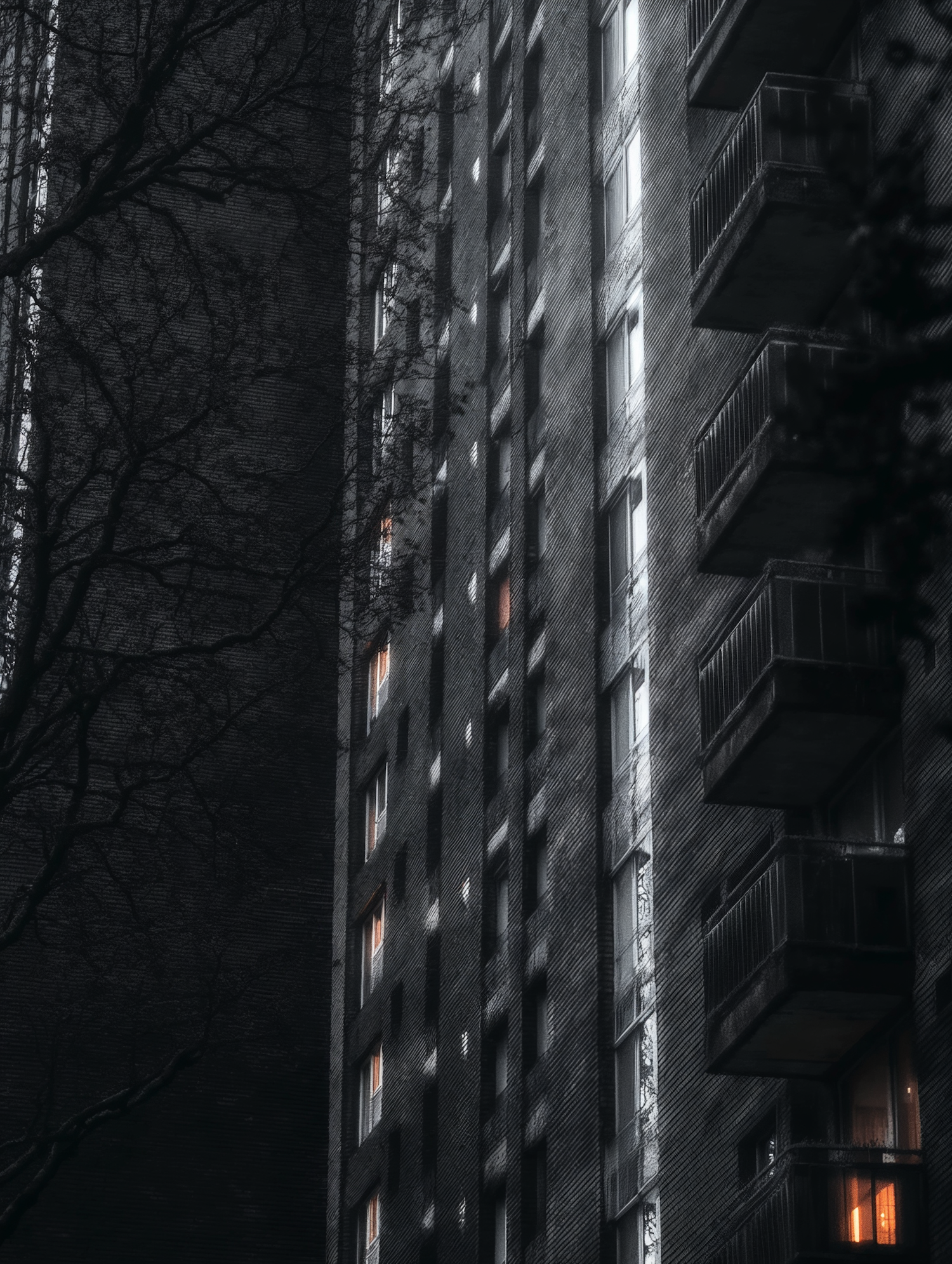 A dark urban apartment building with glowing windows and bare trees, creating a moody, atmospheric cityscape.